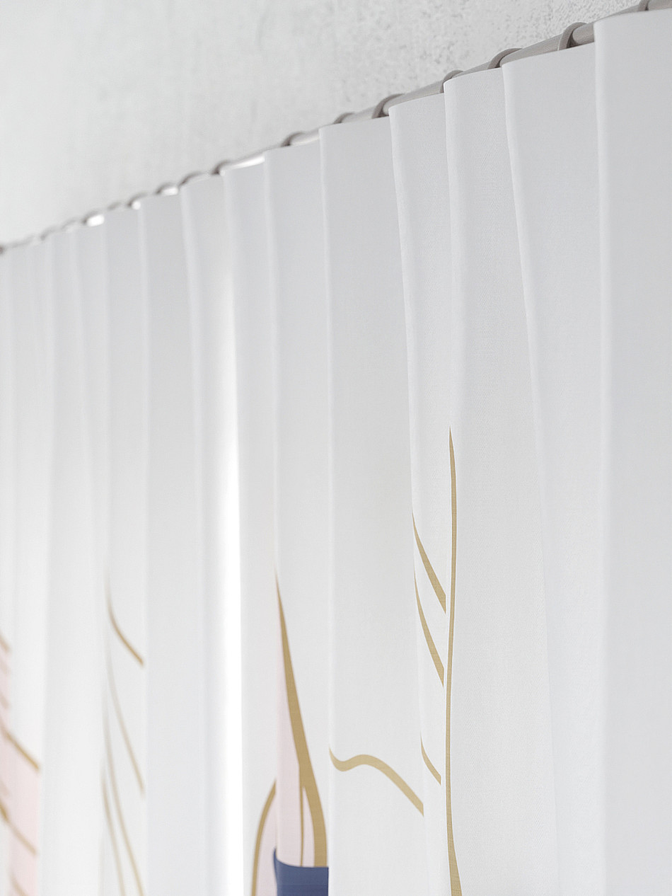 По верхнему краю портьер пришита шторная тесьма 6 см, с ее помощью затянув узелки от кордовых нитей с обеих сторон и стянув их до нужного размера можно сформировать округлые складки, далее вставить крючки в кармашки и повесить на карниз. Обязательно проверьте кордовые нити – они должны быть надежно завязаны, в противном случае во время стягивания они могут вылететь. Шторная тесьма имеет два ряда кармашков, с их помощью можно регулировать не только длину, но и ширину. Такое крепление подходит для всех типов карнизов.