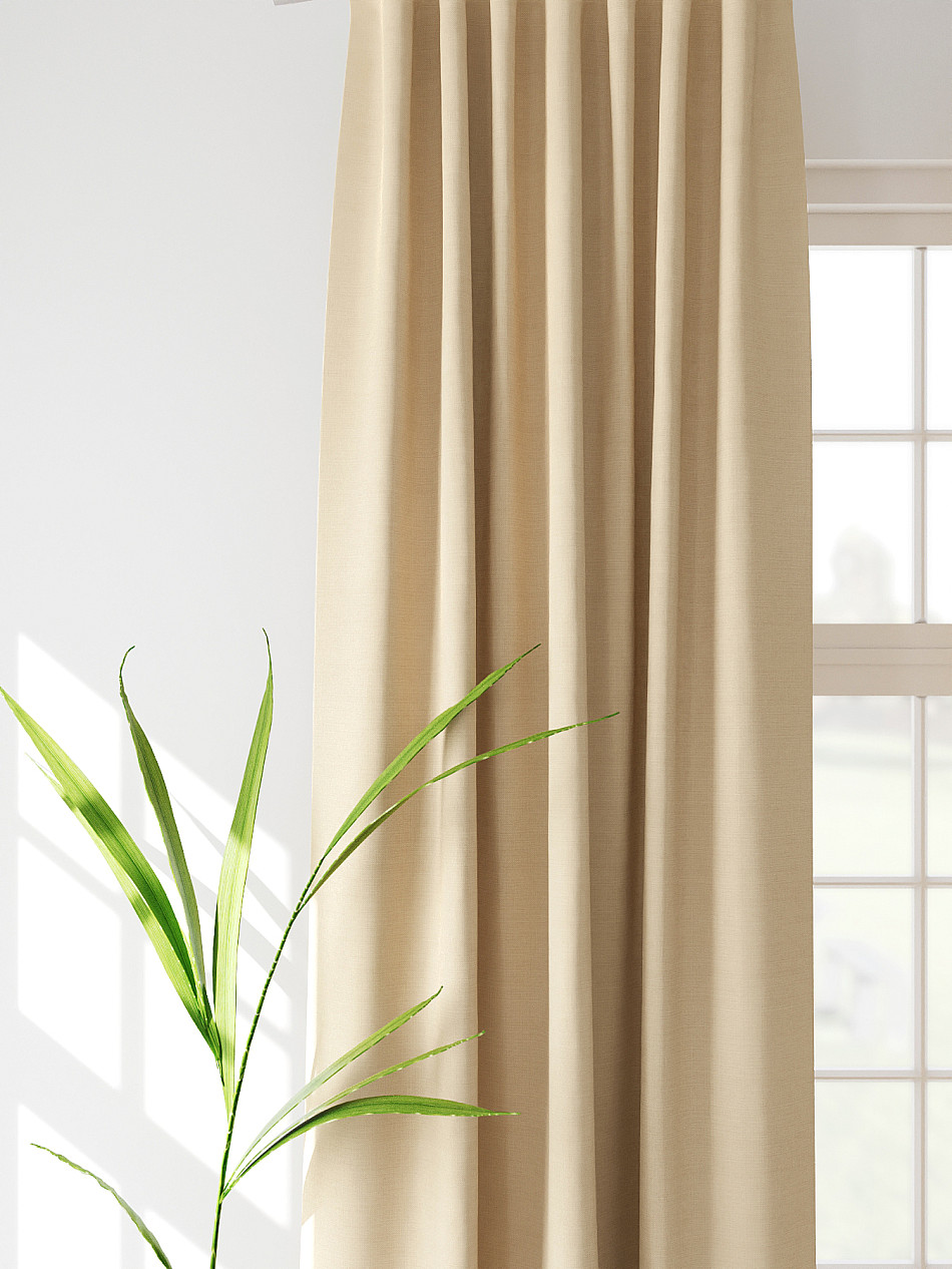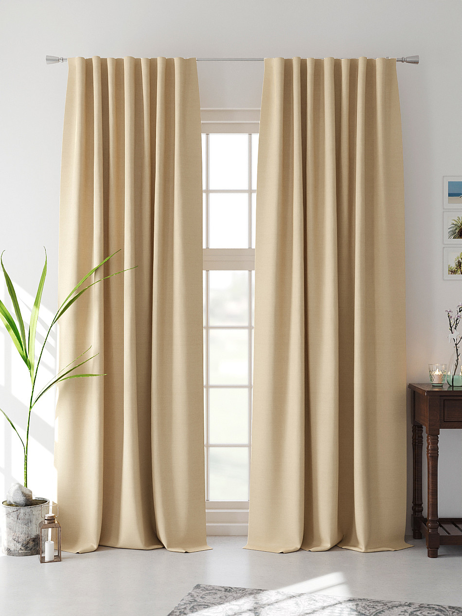 По верхнему краю портьер пришита шторная тесьма 6 см, с ее помощью затянув узелки от кордовых нитей с обеих сторон и стянув их до нужного размера можно сформировать округлые складки, далее вставить крючки в кармашки и повесить на карниз. Обязательно проверьте кордовые нити – они должны быть надежно завязаны, в противном случае во время стягивания они могут вылететь. Шторная тесьма имеет два ряда кармашков, с их помощью можно регулировать не только длину, но и ширину. Такое крепление подходит для всех типов карнизов.