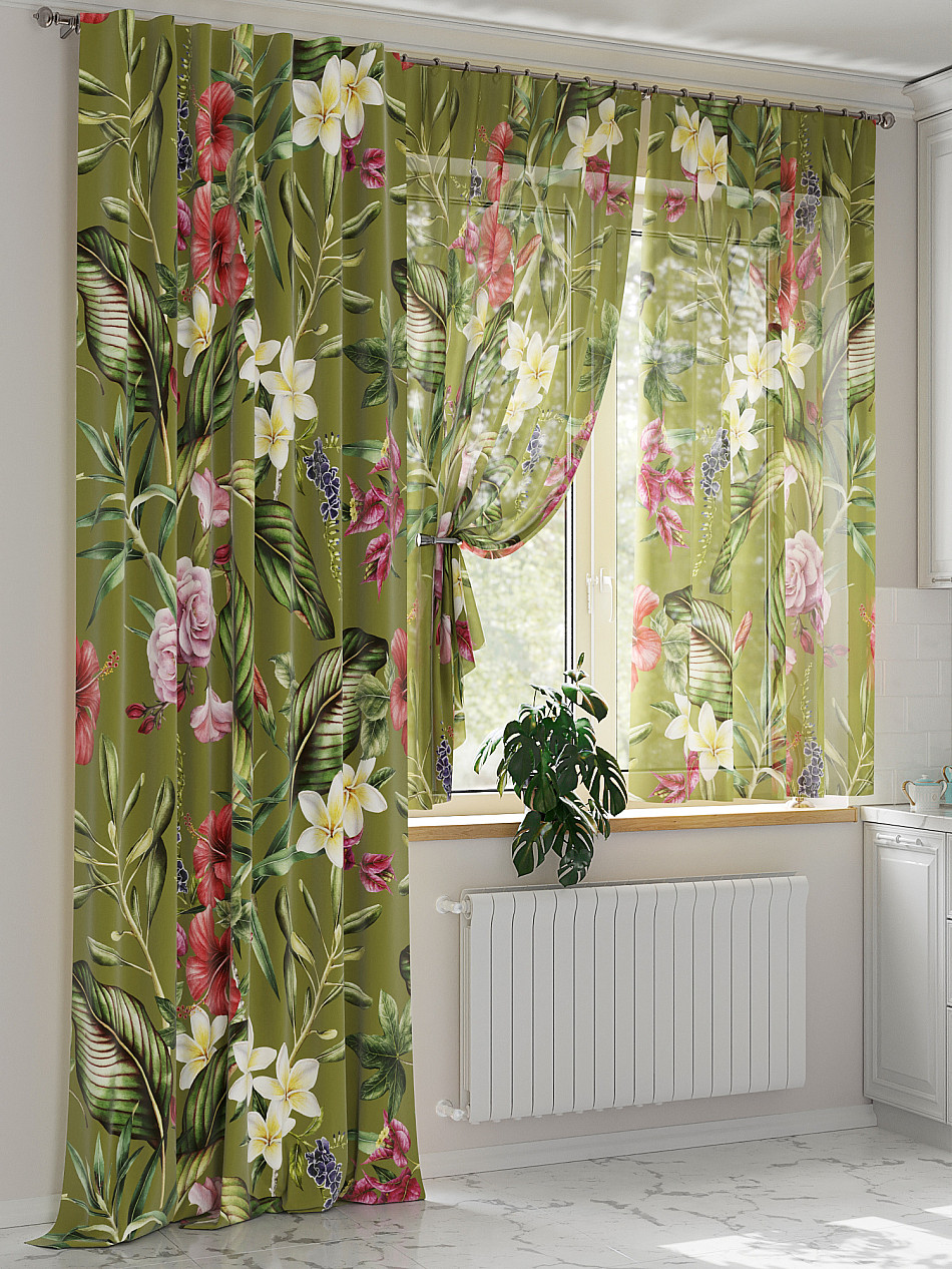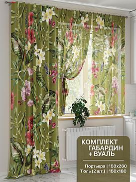 Тюль 2 шт.: Легкая основа (вуаль) оформлена тропическим рисунком. Ширина — 150 см., высота — 180 см., крепление — шторная лента (крючки).