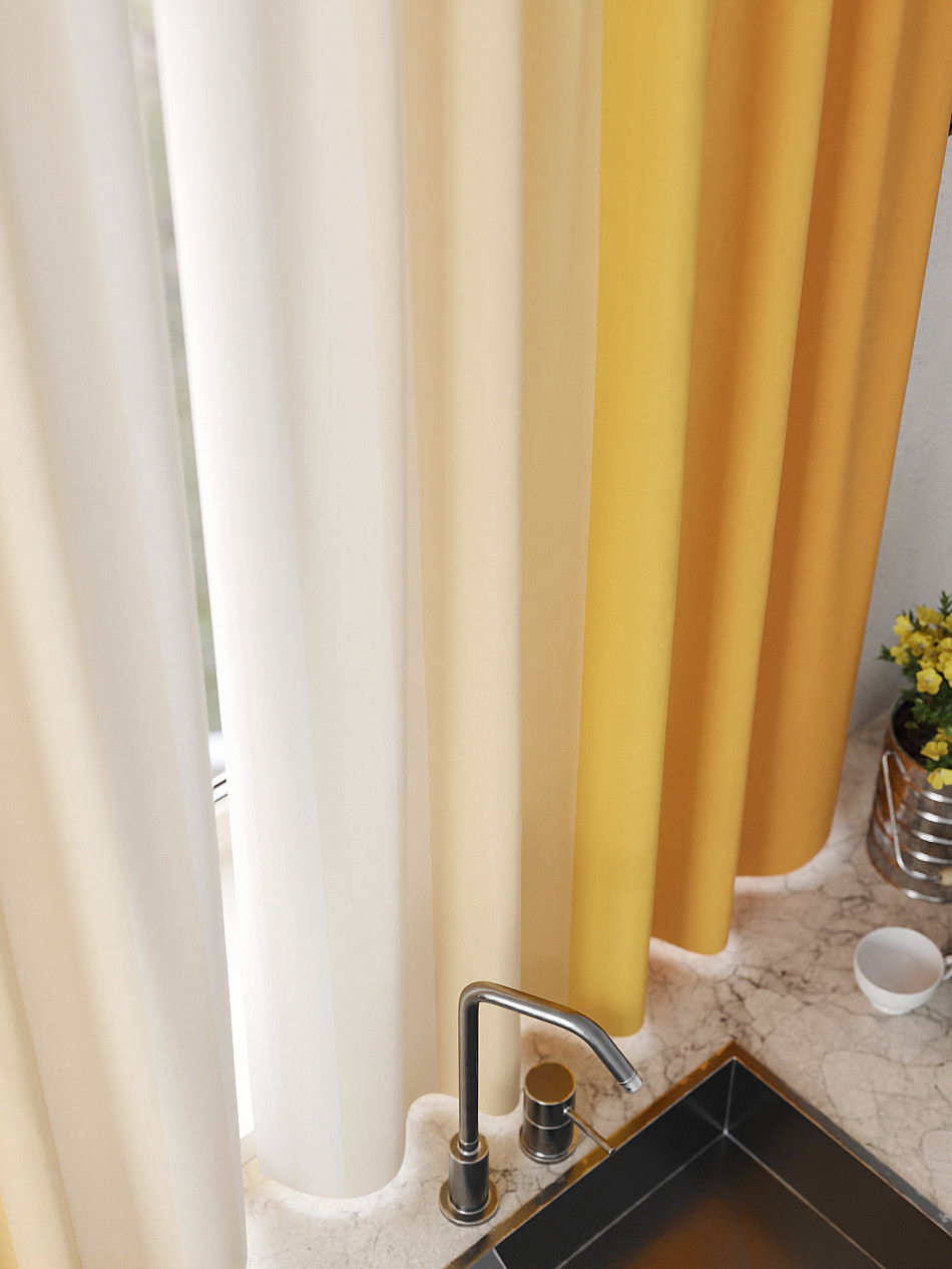 Габардин представляет собой целую группу тканей, которые отличаются содержанием и сочетанием различных волокон – хлопка, шелка, шерсти или синтетики. В зависимости от состава материала, шторы из габардина могут быть разными по плотности и внешнему виду, но всегда отличаются характерным декоративным рубчиком на поверхности. Габардин – идеальная ткань для пошива штор, поскольку она отлично дышит, не мнется, легкая и мягкая на ощупь, но при этом прочная и хорошо защищает от солнечных лучей.