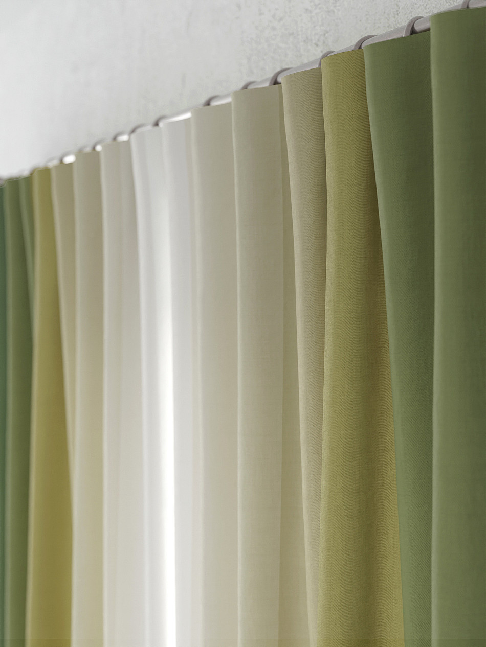 По верхнему краю портьер пришита шторная тесьма 6 см, с ее помощью затянув узелки от кордовых нитей с обеих сторон и стянув их до нужного размера можно сформировать округлые складки, далее вставить крючки в кармашки и повесить на карниз. Обязательно проверьте кордовые нити – они должны быть надежно завязаны, в противном случае во время стягивания они могут вылететь. Шторная тесьма имеет два ряда кармашков, с их помощью можно регулировать не только длину, но и ширину. Такое крепление подходит для всех типов карнизов.