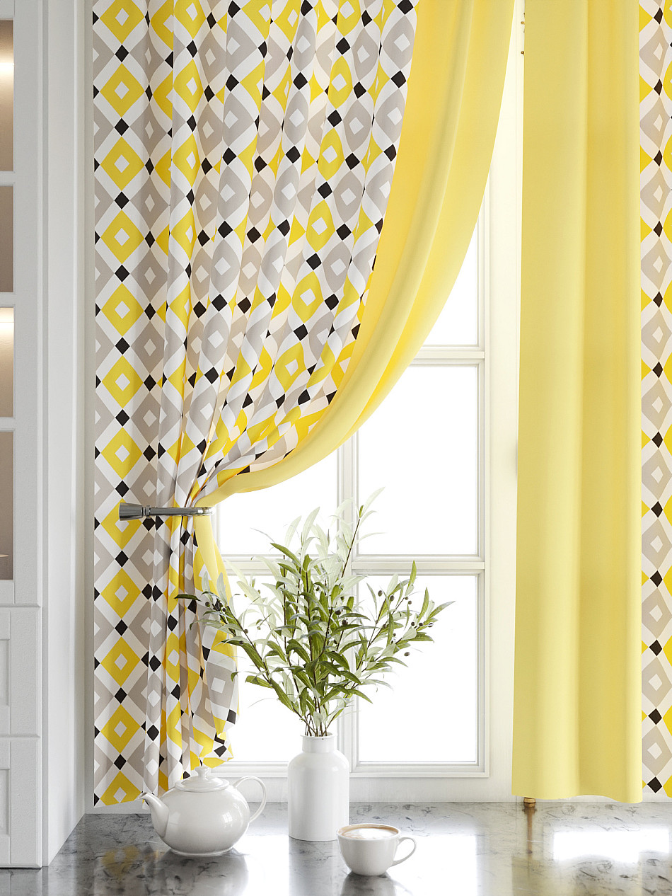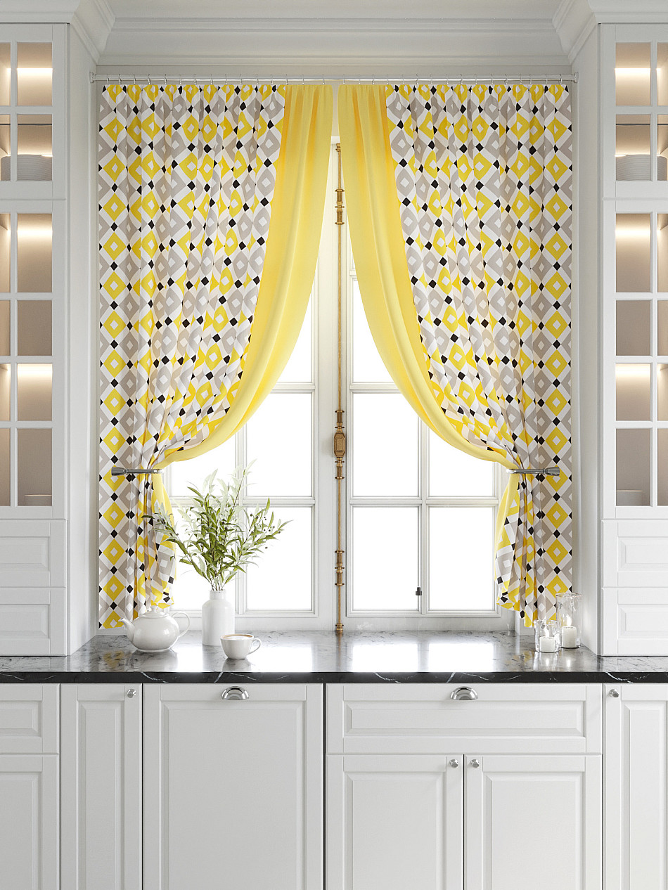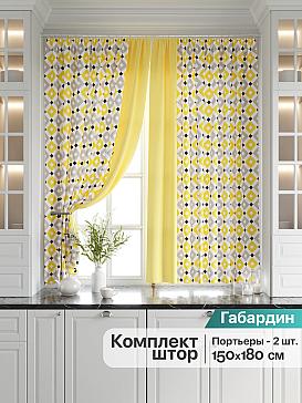 Комплект штор из легкой портьерной ткани (габардин) оформлен печатным рисунком. Печатный рисунок дает широкие возможности обновить интерьер фактически нет требуя ремонта за счет огромного выбора. Ткани с печатным рисунком безопасны и не содержат токсичных веществ. Не смотря на то что, материал легкий, он имеет высокую плотность, мало загрязнятся и не требует особого ухода даже после стирки, что важно для кухонных занавесок. Шторы не выцветают, не растягиваются, превосходно драпируются, образуя струящиеся складки. Прекрасное решение для создания красоты и уюта с помощью уникальных дизайнов.