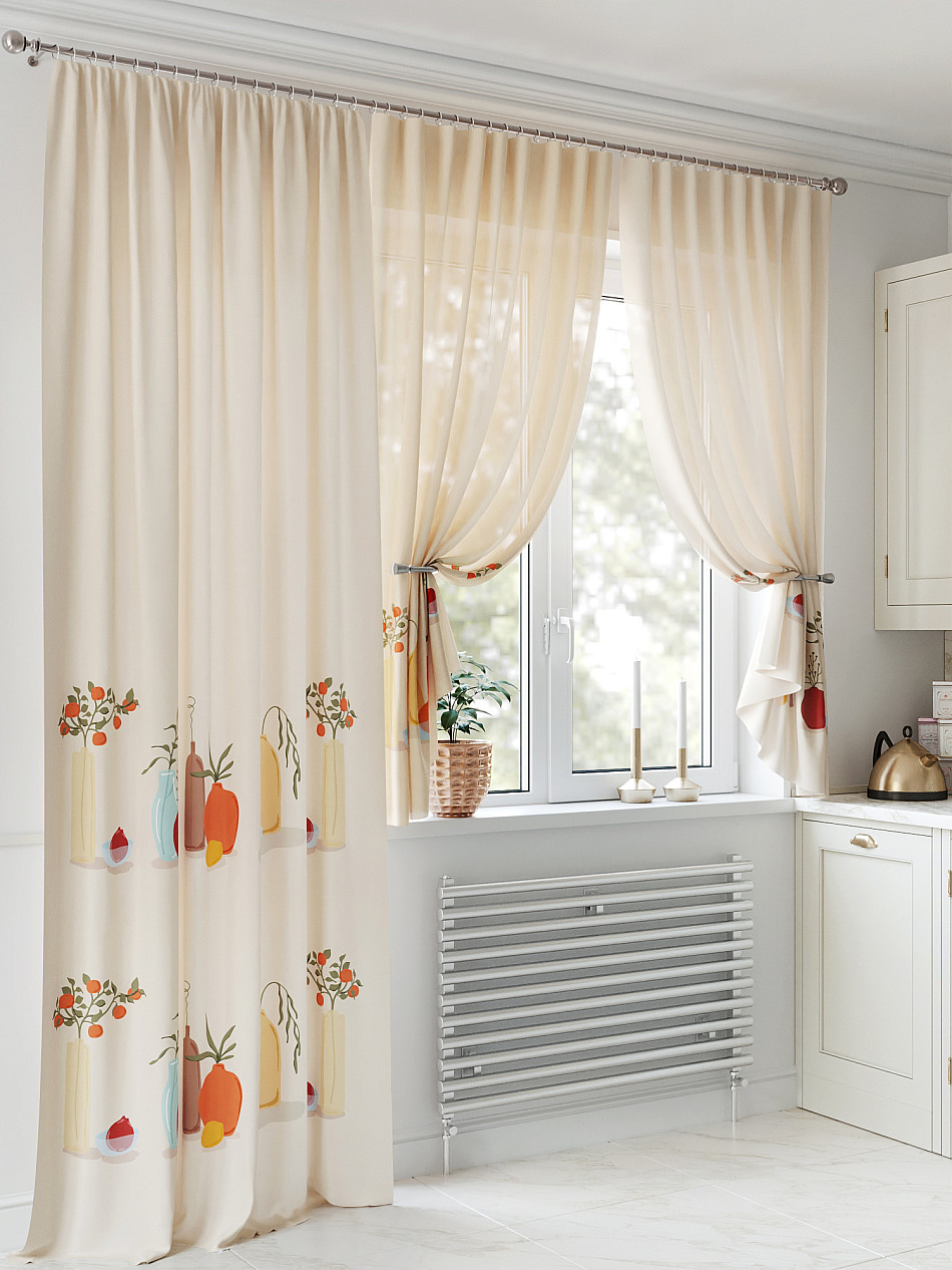Портьера 150х250 см — 1 шт., вуаль 150х180 см — 2 шт. ( Уменьшить высоту ) Крепление: шторная лента (крючки), кулиска Подробнее