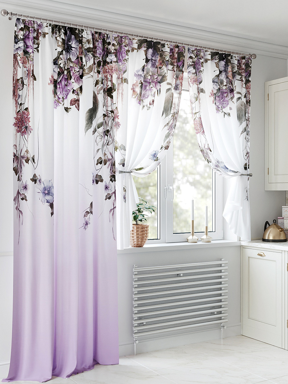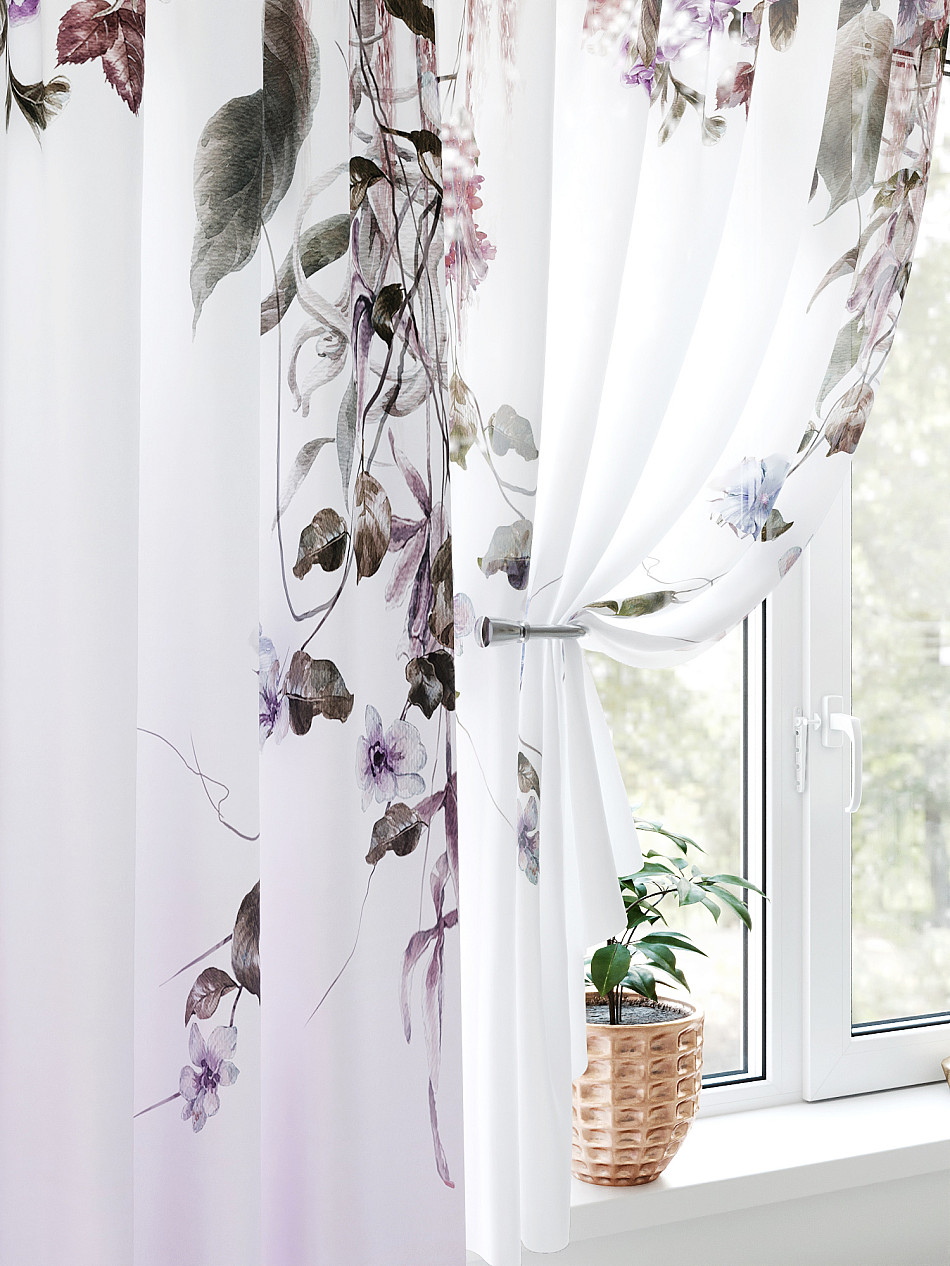 Тюль 2 шт.: Легкая основа (вуаль) оформлена флористическим рисунком. Ширина — 150 см., высота — 180 см., крепление — шторная лента (крючки).