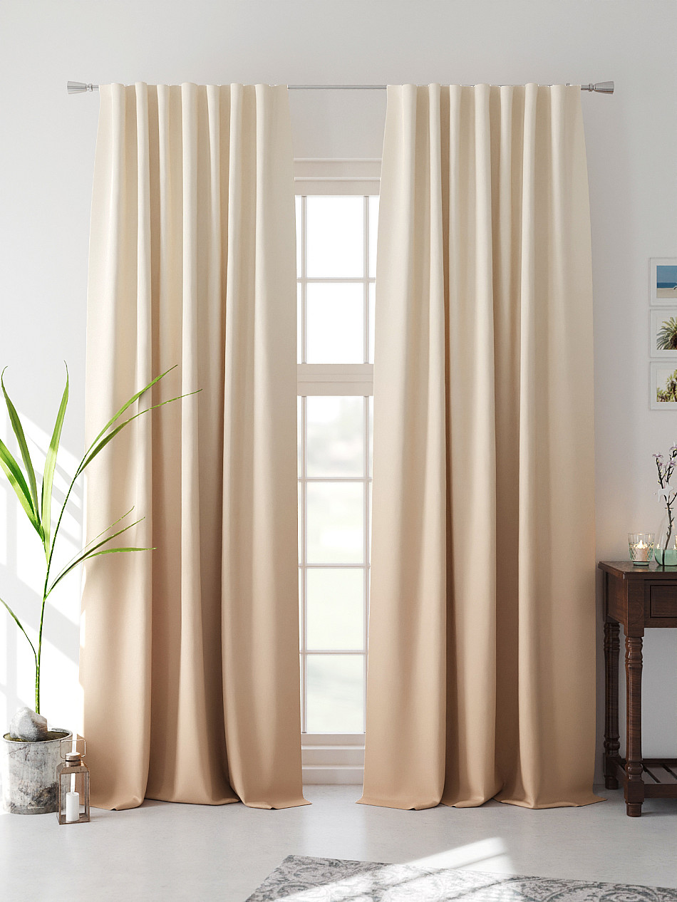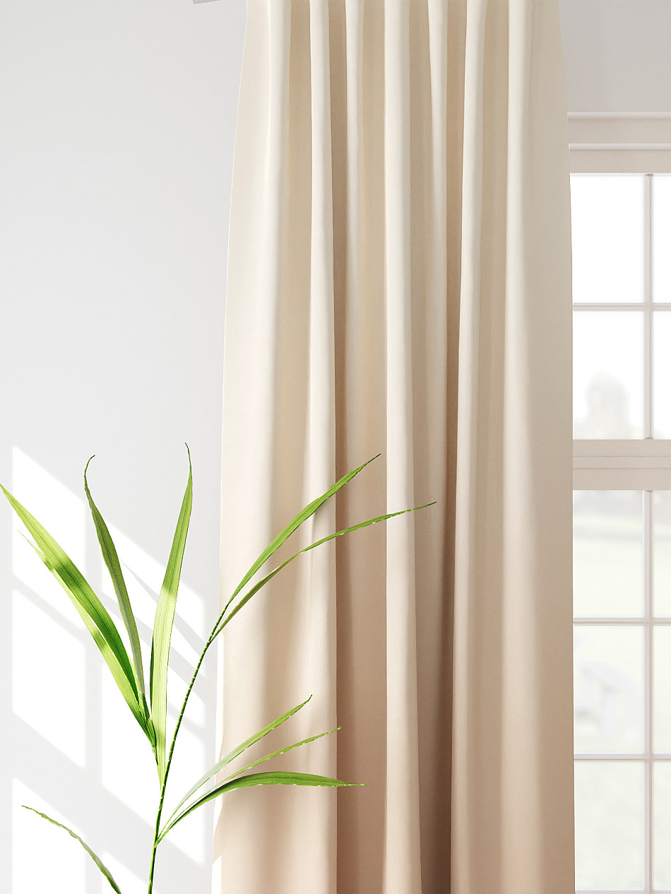 По верхнему краю портьер пришита шторная тесьма 6 см, с ее помощью затянув узелки от кордовых нитей с обеих сторон и стянув их до нужного размера можно сформировать округлые складки, далее вставить крючки в кармашки и повесить на карниз. Обязательно проверьте кордовые нити – они должны быть надежно завязаны, в противном случае во время стягивания они могут вылететь. Шторная тесьма имеет два ряда кармашков, с их помощью можно регулировать не только длину, но и ширину. Такое крепление подходит для всех типов карнизов.