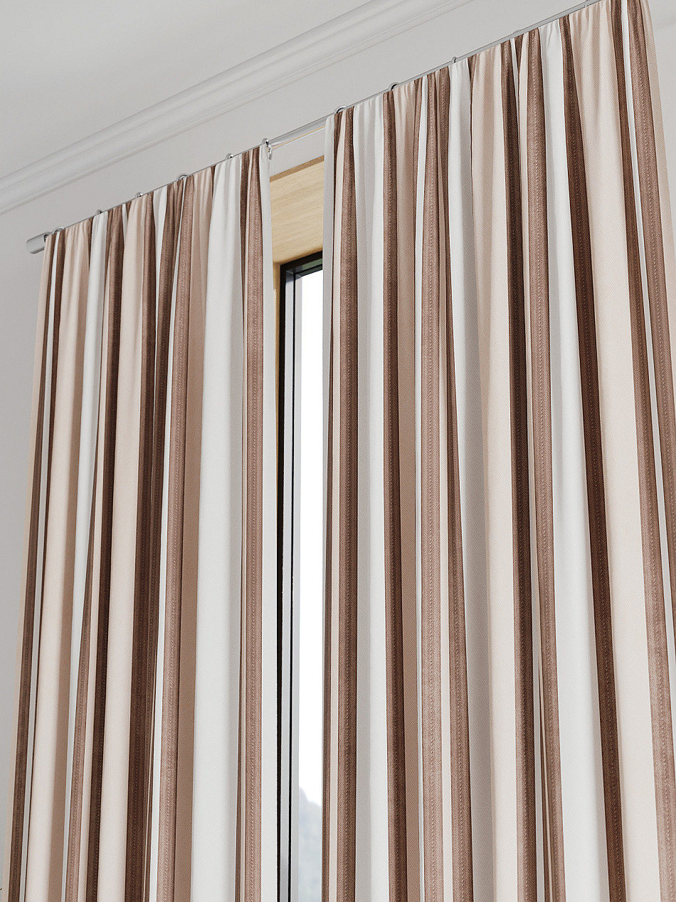 По верхнему краю портьеры пришита шторная тесьма 6 см, с ее помощью затянув узелки от кордовых нитей с обеих сторон и стянув их до нужного размера можно сформировать округлые складки, далее вставить крючки в кармашки и повесить на карниз. Обязательно проверьте кордовые нити – они должны быть надежно завязаны, в противном случае во время стягивания они могут вылететь. Шторная тесьма имеет два ряда кармашков, с их помощью можно регулировать не только длину, но и ширину. Такое крепление подходит для всех типов карнизов.