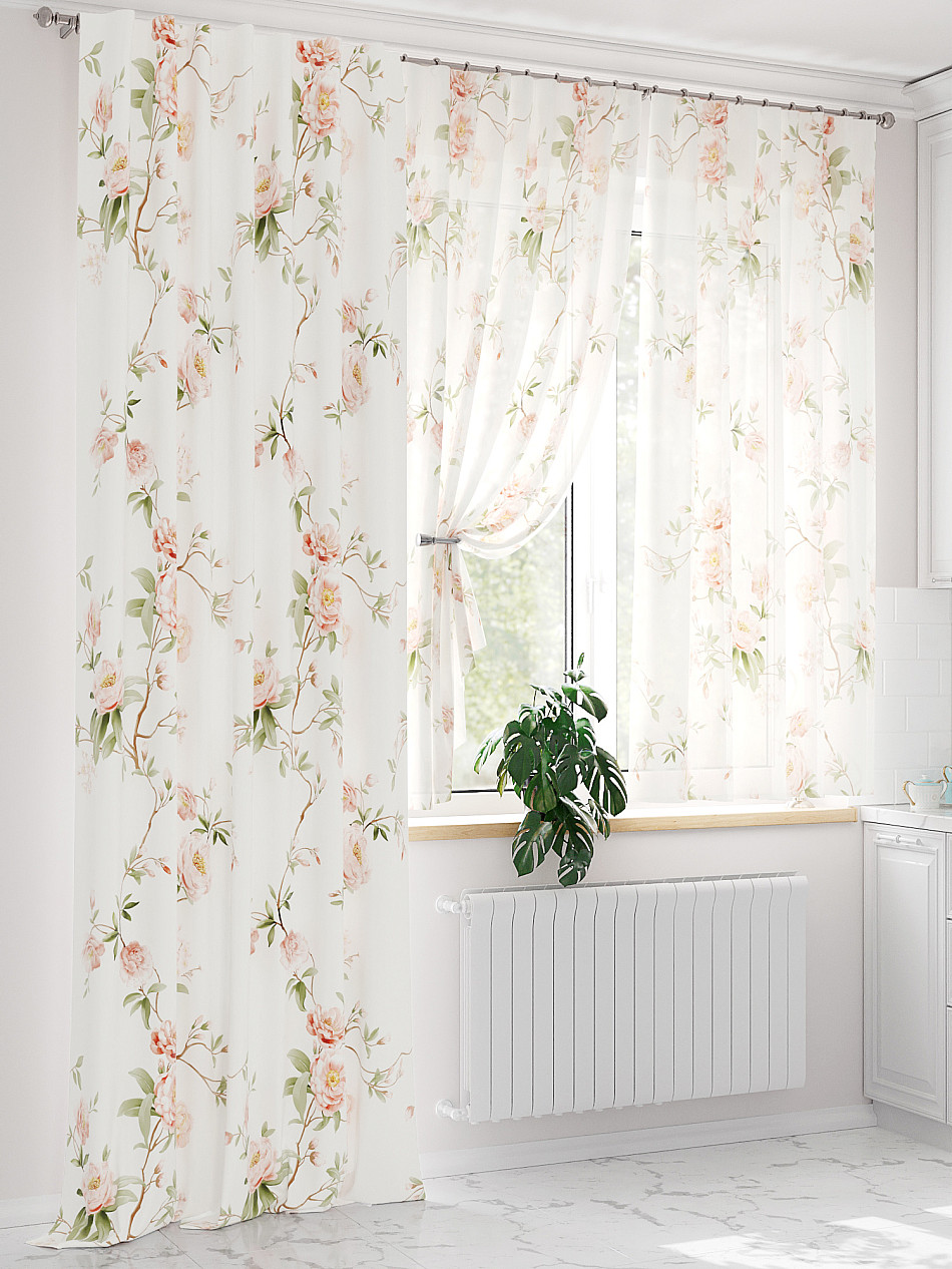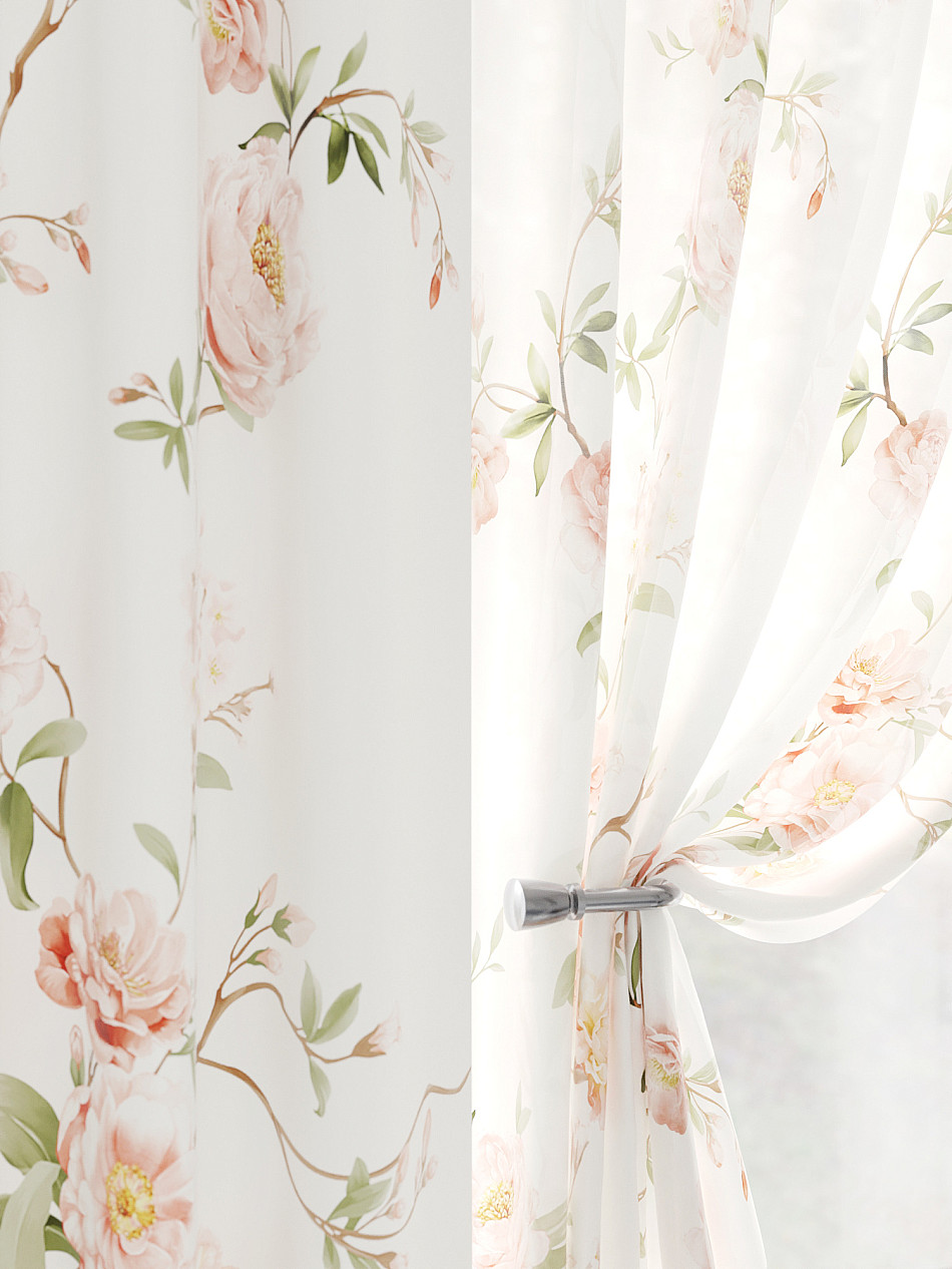 Тюль 2 шт.: Легкая основа (вуаль) оформлена флористическим рисунком. Ширина — 150 см., высота — 180 см., крепление — шторная лента (крючки).
