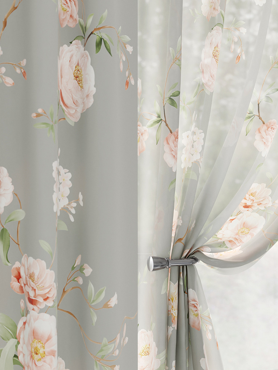 Тюль 2 шт.: Легкая основа (вуаль) оформлена флористическим рисунком. Ширина — 150 см., высота — 180 см., крепление — шторная лента (крючки).