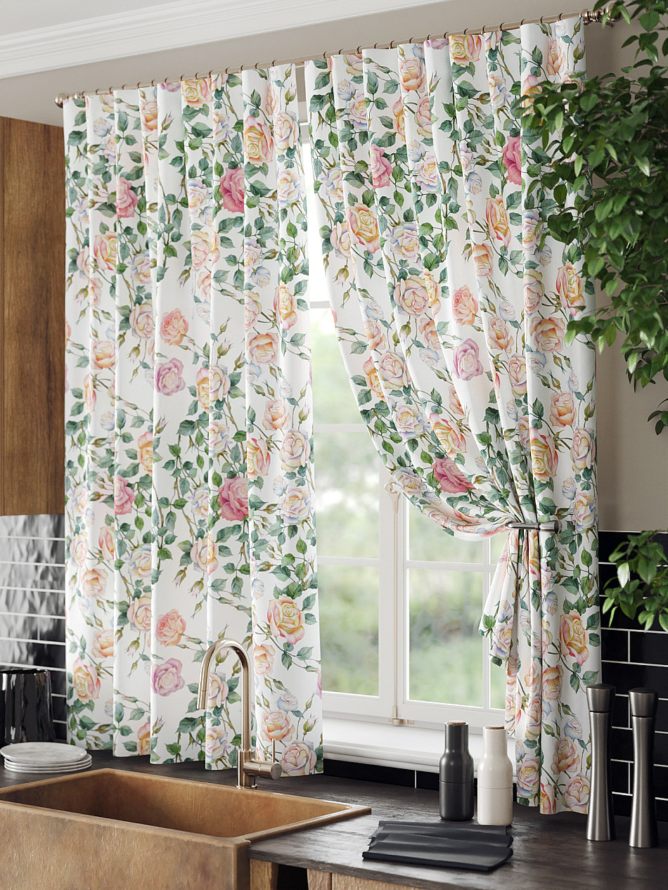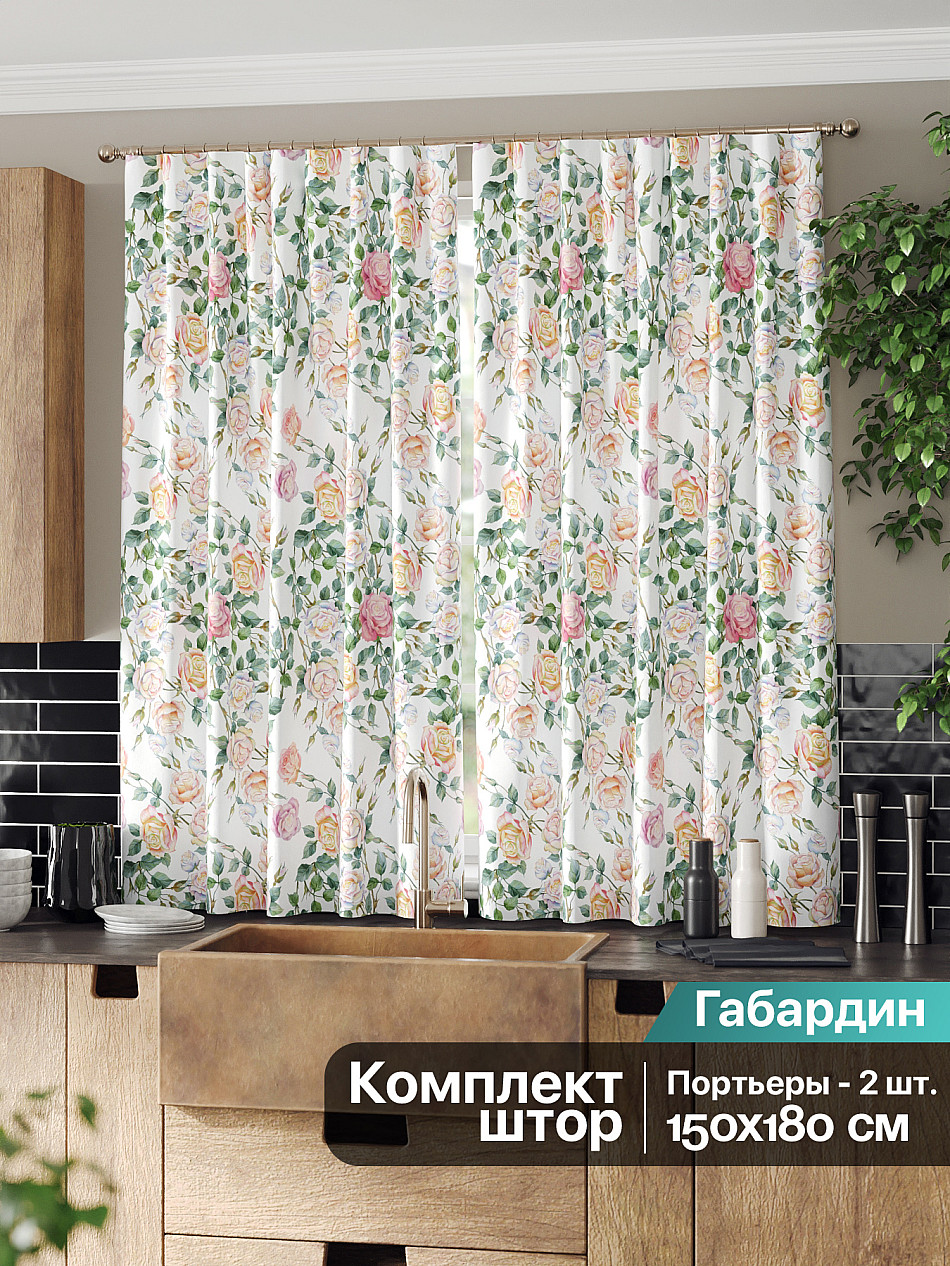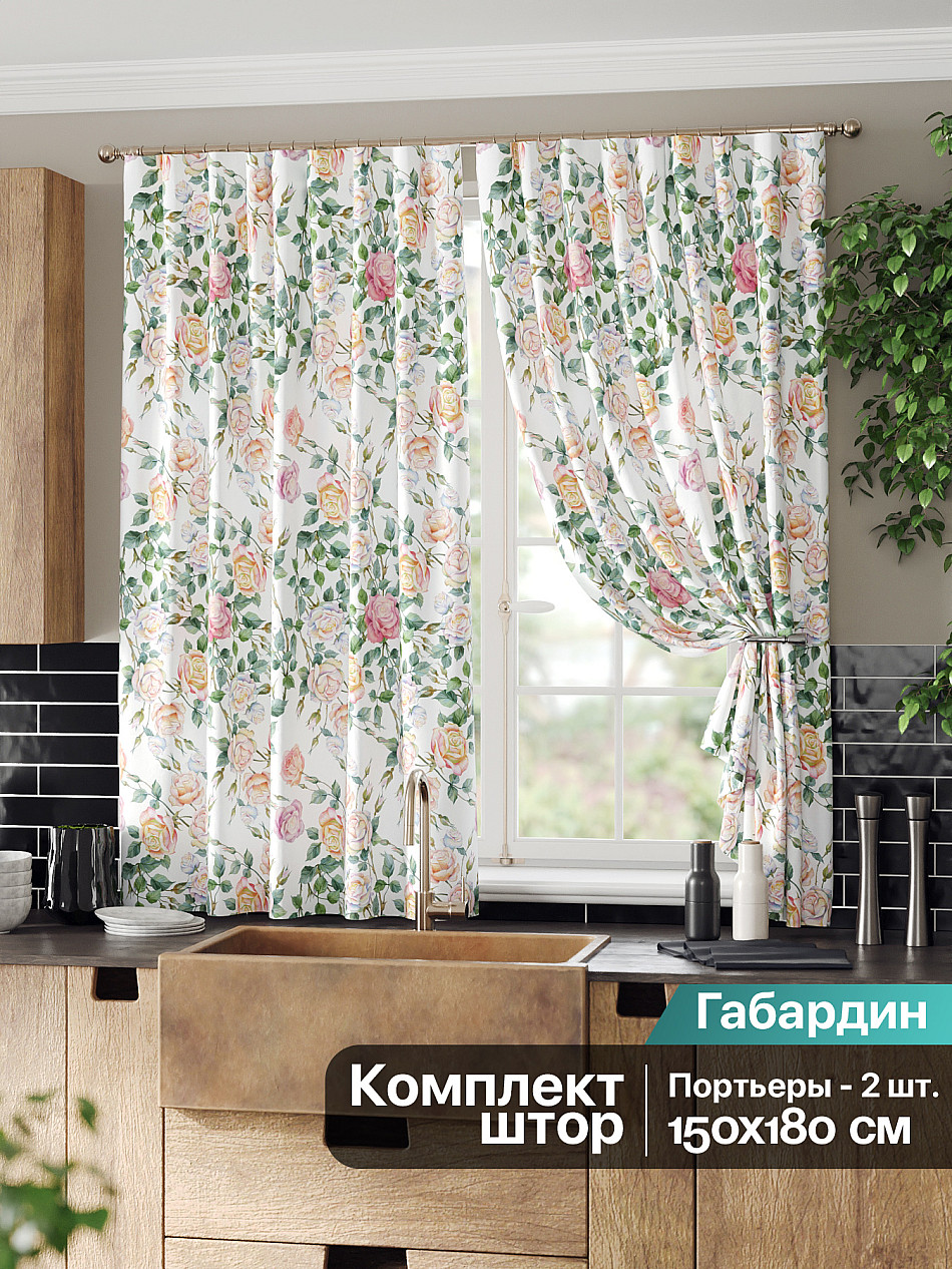 Комплект штор из легкой портьерной ткани (габардин) оформлен печатным рисунком. Печатный рисунок дает широкие возможности обновить интерьер фактически нет требуя ремонта за счет огромного выбора. Ткани с печатным рисунком безопасны и не содержат токсичных веществ. Не смотря на то что, материал легкий, он имеет высокую плотность, мало загрязнятся и не требует особого ухода даже после стирки, что важно для кухонных занавесок. Шторы не выцветают, не растягиваются, превосходно драпируются, образуя струящиеся складки. Прекрасное решение для создания красоты и уюта с помощью уникальных дизайнов.