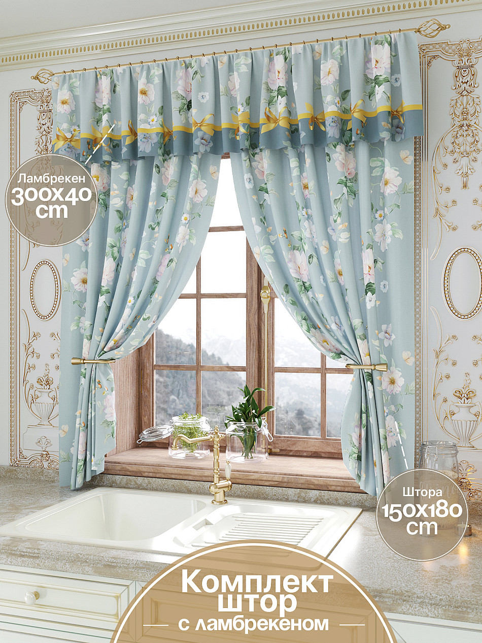 Ламбрекен: легкая основа (Габардин). Ширина — 300 см, высота — 40 см, крепление — шторная лента (крючки).