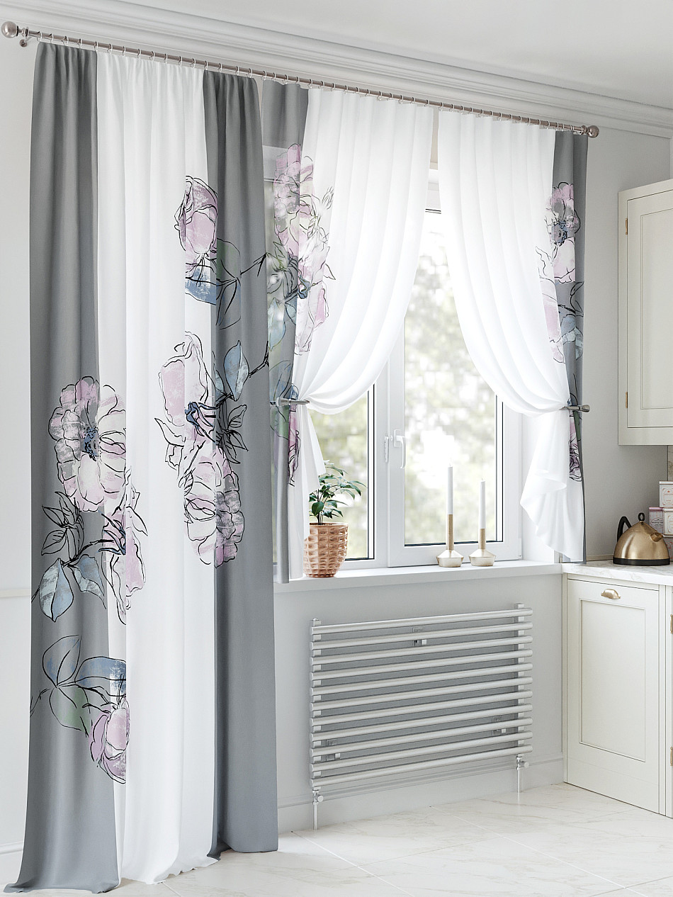 Портьера 150х270 см — 1 шт., вуаль 150х180 см — 2 шт. ( Уменьшить высоту ) Крепление: шторная лента (крючки), кулиска Подробнее