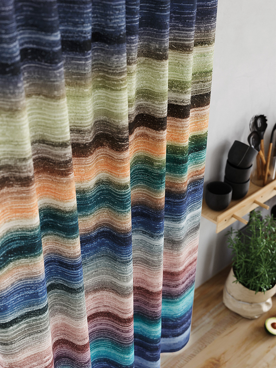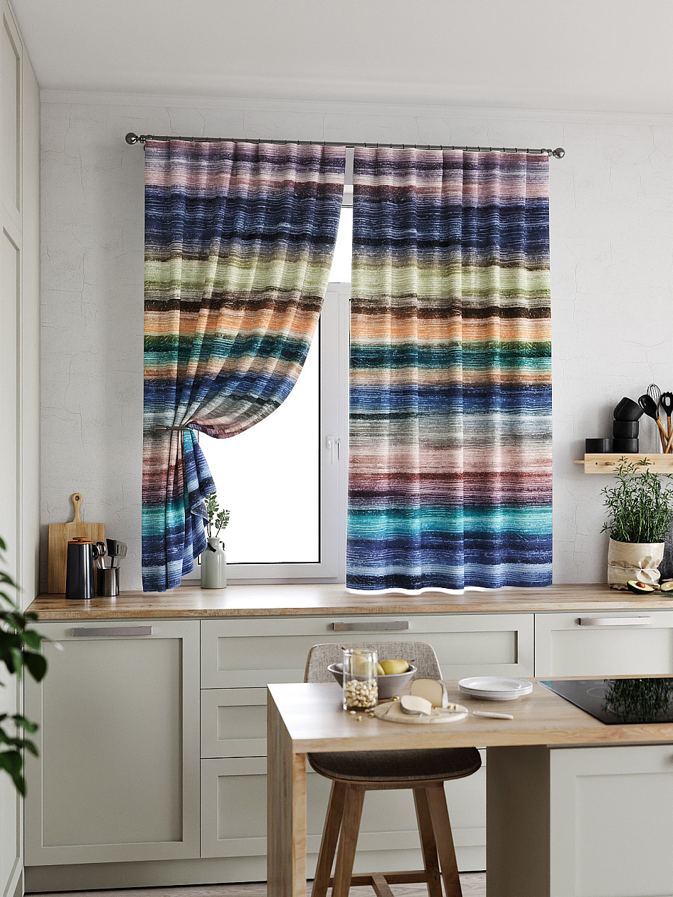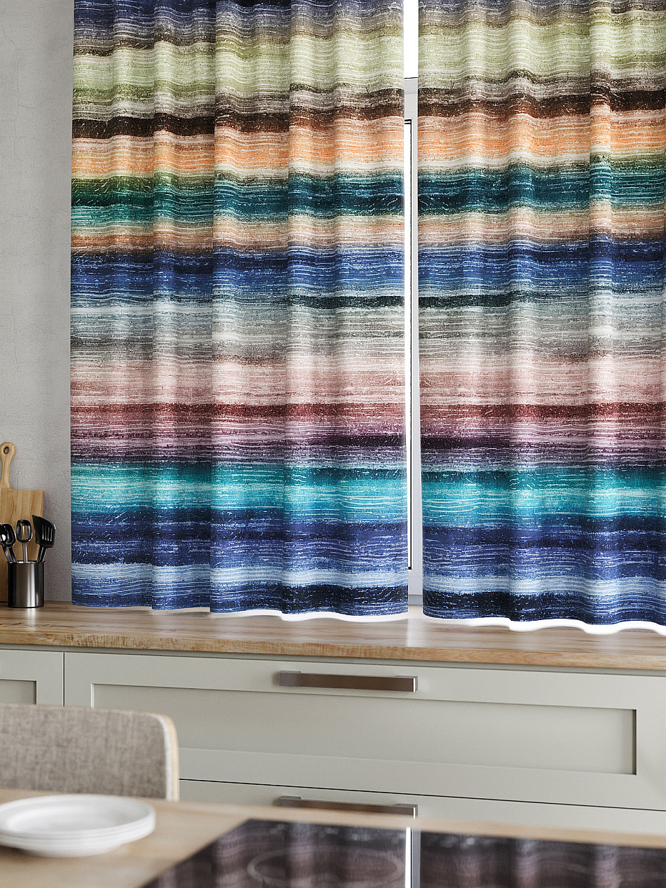 Комплект штор из легкой портьерной ткани (габардин) оформлен печатным рисунком. Печатный рисунок дает широкие возможности обновить интерьер фактически нет требуя ремонта за счет огромного выбора. Ткани с печатным рисунком безопасны и не содержат токсичных веществ. Не смотря на то что, материал легкий, он имеет высокую плотность, мало загрязнятся и не требует особого ухода даже после стирки, что важно для кухонных занавесок. Шторы не выцветают, не растягиваются, превосходно драпируются, образуя струящиеся складки. Прекрасное решение для создания красоты и уюта с помощью уникальных дизайнов.