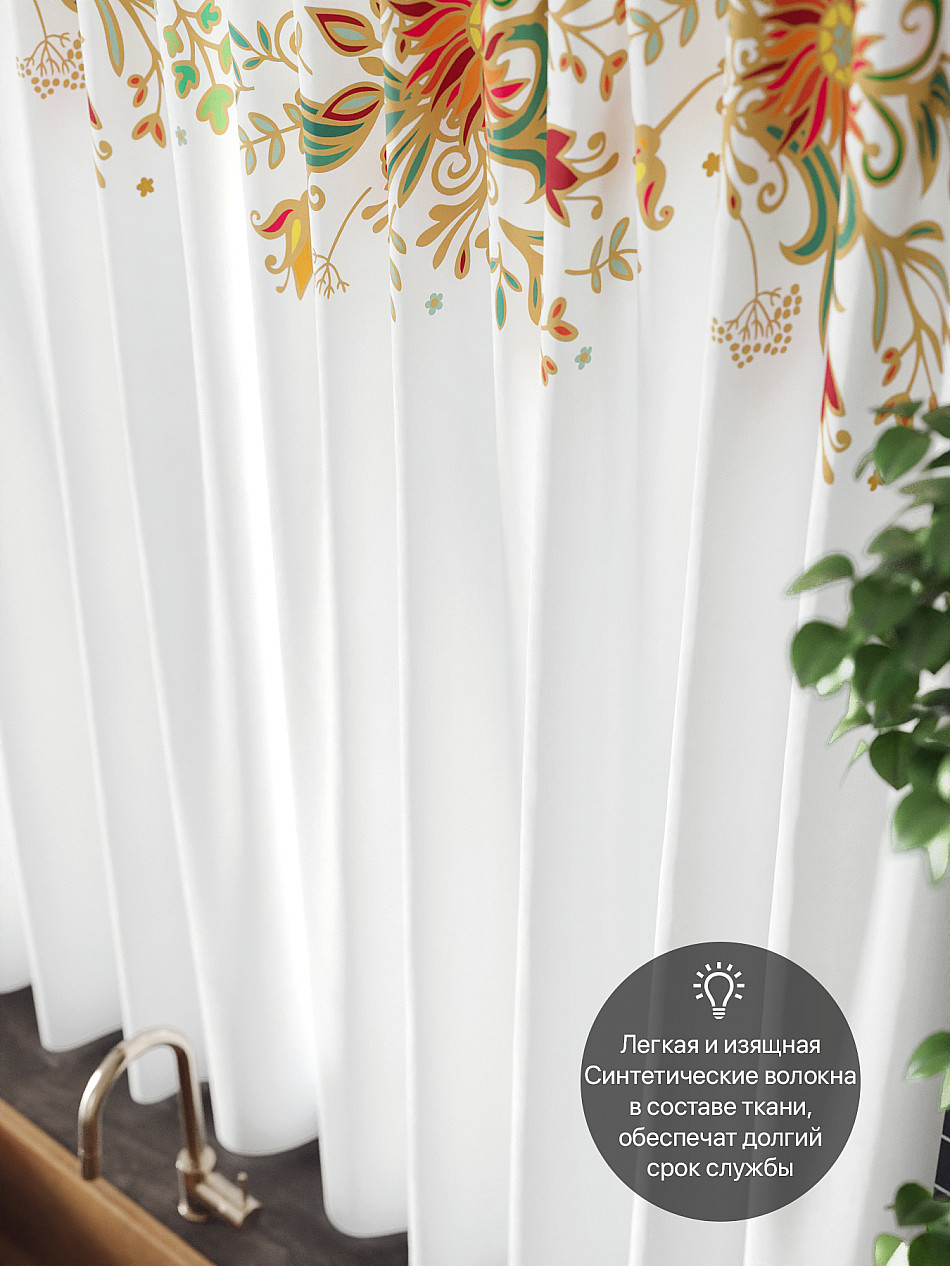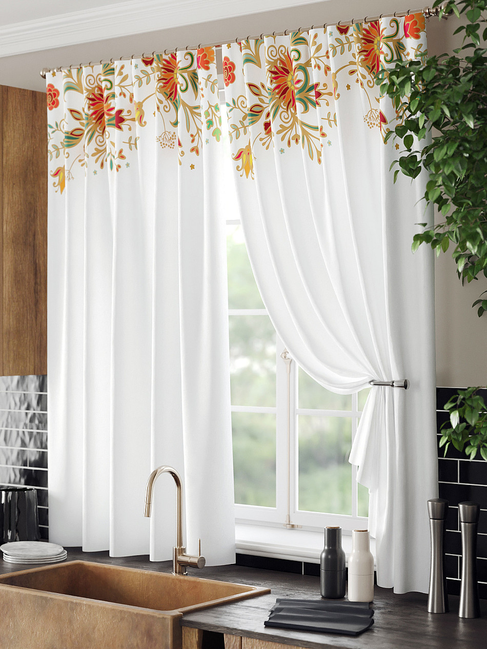 Комплект штор из легкой портьерной ткани (габардин) оформлен печатным рисунком. Печатный рисунок дает широкие возможности обновить интерьер фактически нет требуя ремонта за счет огромного выбора. Ткани с печатным рисунком безопасны и не содержат токсичных веществ. Не смотря на то что, материал легкий, он имеет высокую плотность, мало загрязнятся и не требует особого ухода даже после стирки, что важно для кухонных занавесок. Шторы не выцветают, не растягиваются, превосходно драпируются, образуя струящиеся складки. Прекрасное решение для создания красоты и уюта с помощью уникальных дизайнов.