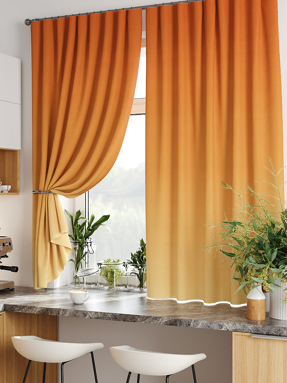 Комплект штор из легкой портьерной ткани (габардин) оформлен печатным рисунком. Печатный рисунок дает широкие возможности обновить интерьер фактически нет требуя ремонта за счет огромного выбора. Ткани с печатным рисунком безопасны и не содержат токсичных веществ. Не смотря на то что, материал легкий, он имеет высокую плотность, мало загрязнятся и не требует особого ухода даже после стирки, что важно для кухонных занавесок. Шторы не выцветают, не растягиваются, превосходно драпируются, образуя струящиеся складки. Прекрасное решение для создания красоты и уюта с помощью уникальных дизайнов.