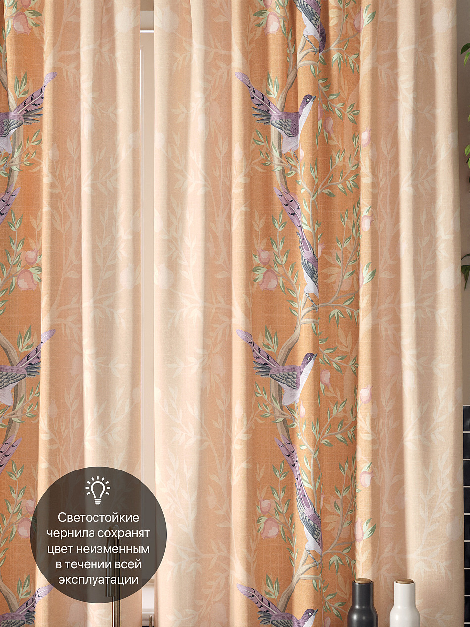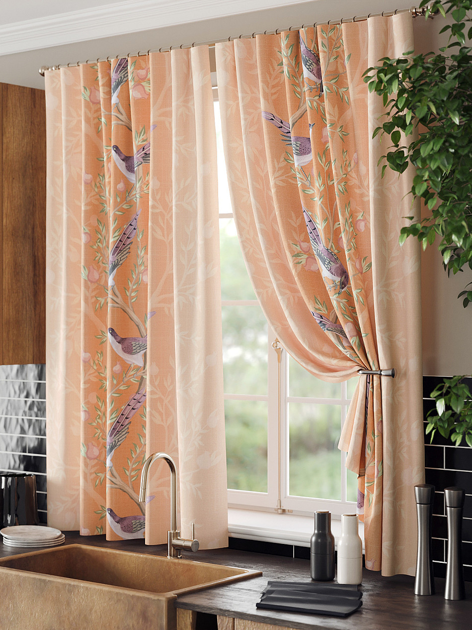 Комплект штор из легкой портьерной ткани (габардин) оформлен печатным рисунком. Печатный рисунок дает широкие возможности обновить интерьер фактически нет требуя ремонта за счет огромного выбора. Ткани с печатным рисунком безопасны и не содержат токсичных веществ. Не смотря на то что, материал легкий, он имеет высокую плотность, мало загрязнятся и не требует особого ухода даже после стирки, что важно для кухонных занавесок. Шторы не выцветают, не растягиваются, превосходно драпируются, образуя струящиеся складки. Прекрасное решение для создания красоты и уюта с помощью уникальных дизайнов.
