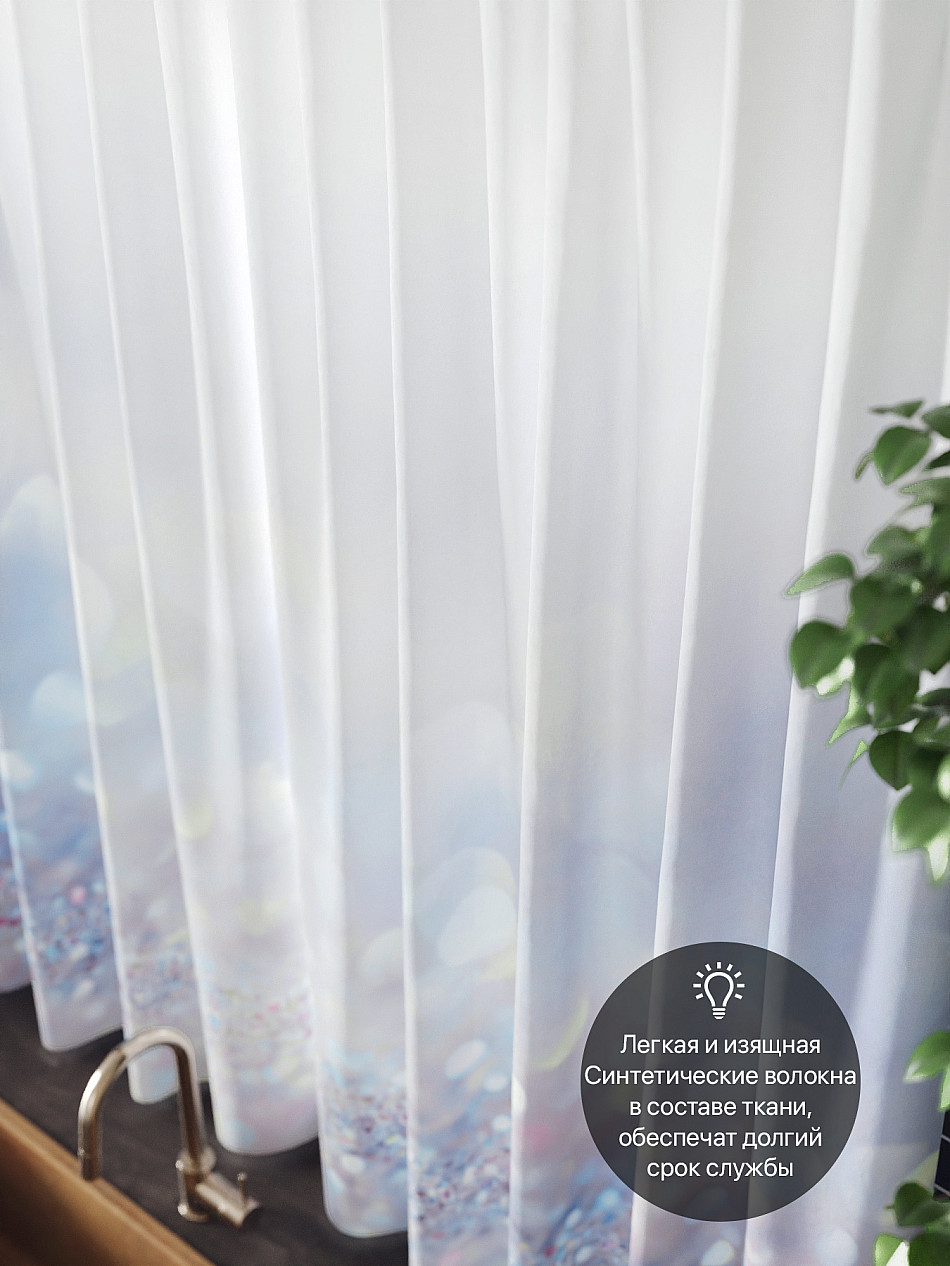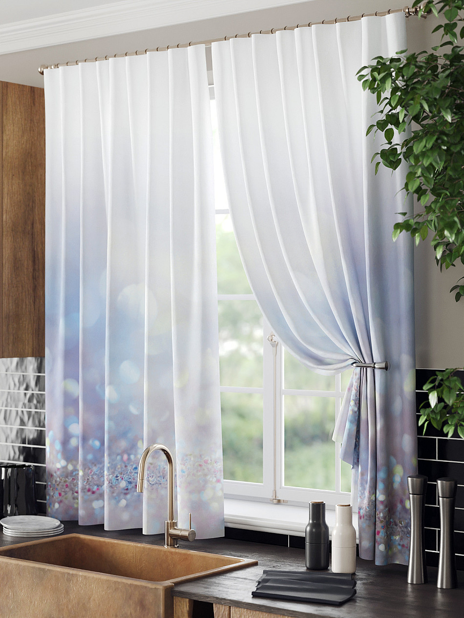 Комплект штор из легкой портьерной ткани (габардин) оформлен печатным рисунком. Печатный рисунок дает широкие возможности обновить интерьер фактически нет требуя ремонта за счет огромного выбора. Ткани с печатным рисунком безопасны и не содержат токсичных веществ. Не смотря на то что, материал легкий, он имеет высокую плотность, мало загрязнятся и не требует особого ухода даже после стирки, что важно для кухонных занавесок. Шторы не выцветают, не растягиваются, превосходно драпируются, образуя струящиеся складки. Прекрасное решение для создания красоты и уюта с помощью уникальных дизайнов.