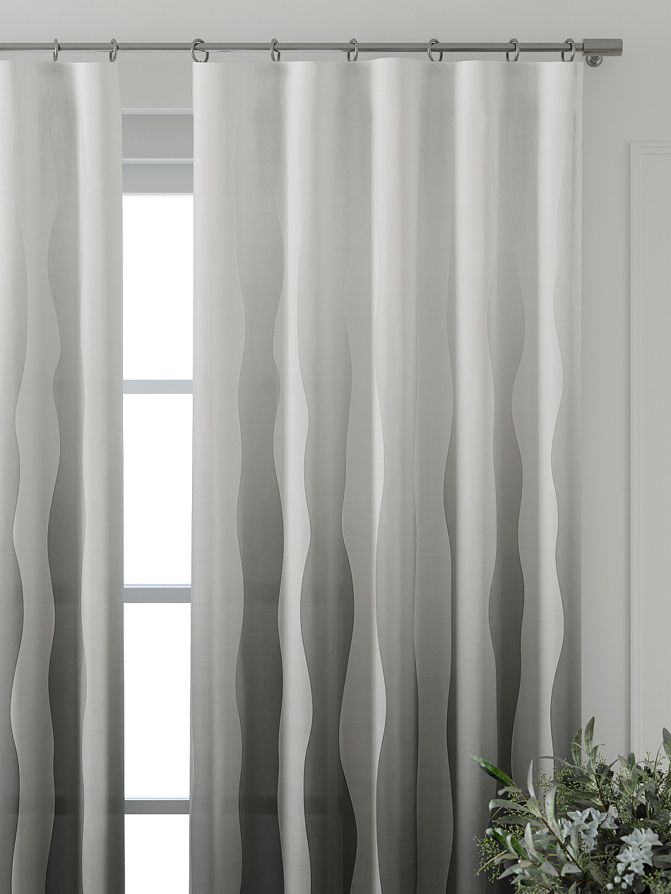 По верхнему краю портьер пришита шторная тесьма 6 см, с ее помощью затянув узелки от кордовых нитей с обеих сторон и стянув их до нужного размера можно сформировать округлые складки, далее вставить крючки в кармашки и повесить на карниз. Обязательно проверьте кордовые нити – они должны быть надежно завязаны, в противном случае во время стягивания они могут вылететь. Шторная тесьма имеет два ряда кармашков, с их помощью можно регулировать не только длину, но и ширину. Такое крепление подходит для всех типов карнизов.