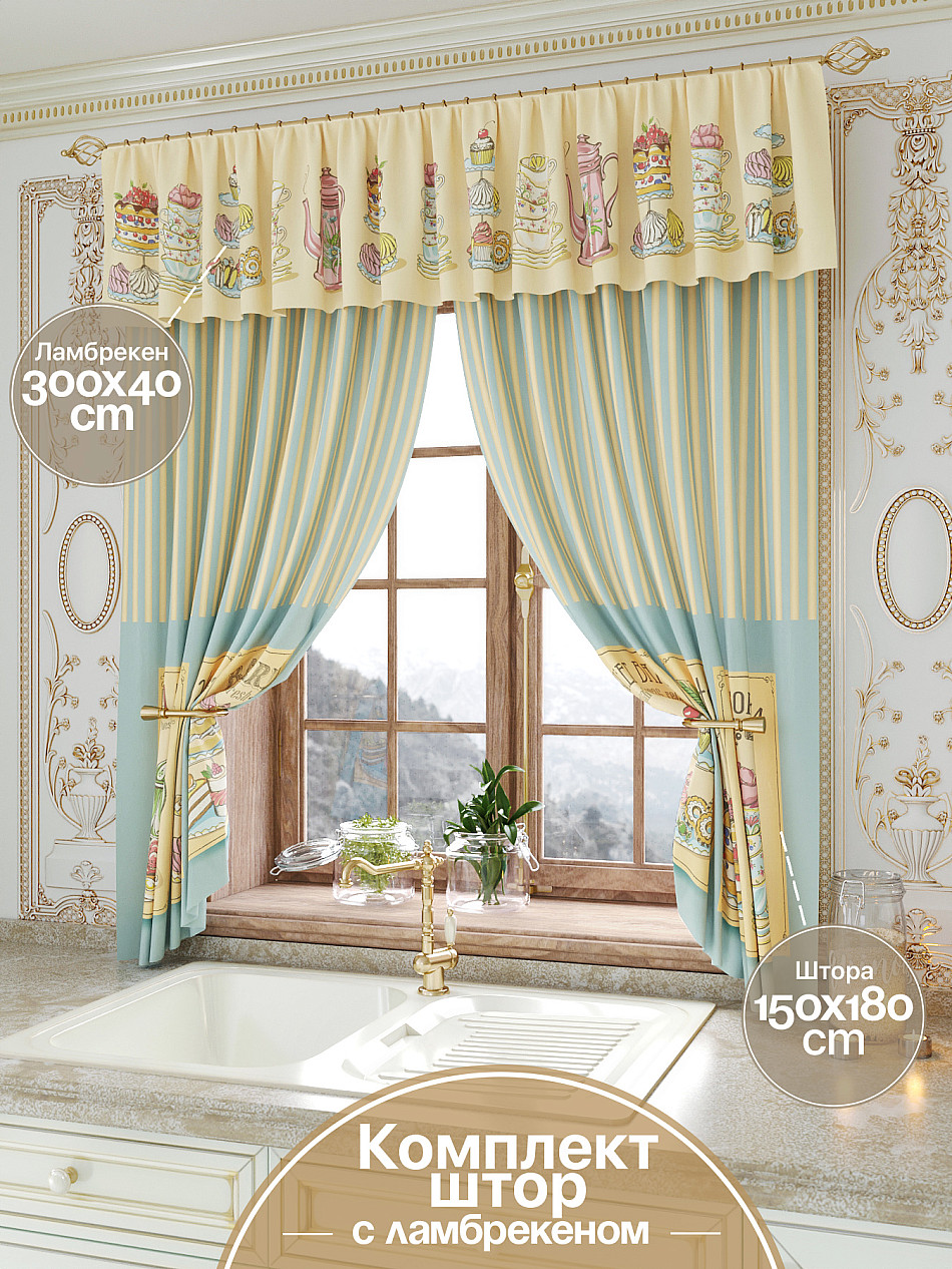 Ламбрекен: легкая основа (Габардин). Ширина — 300 см, высота — 40 см, крепление — шторная лента (крючки).
