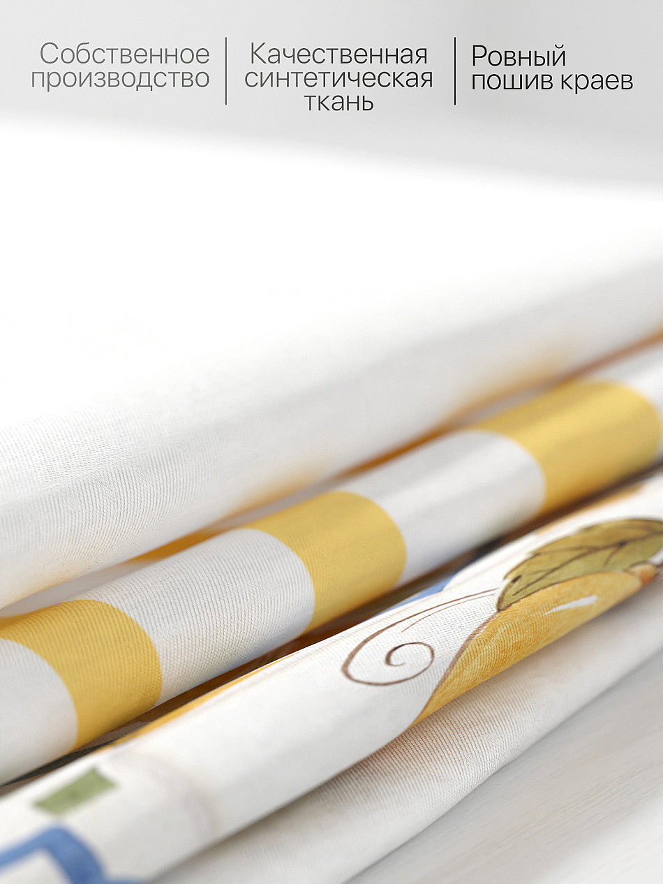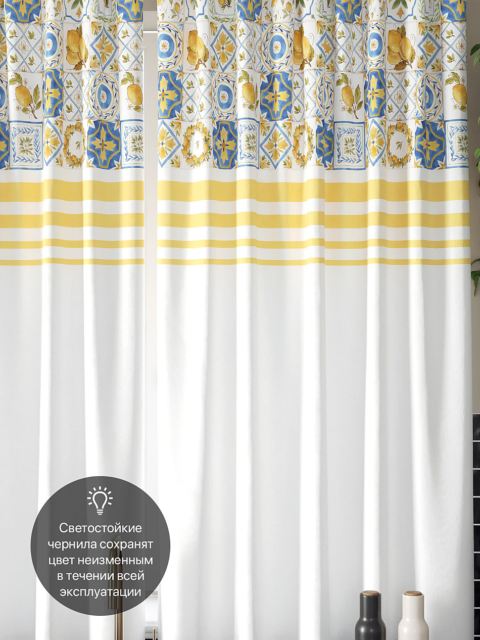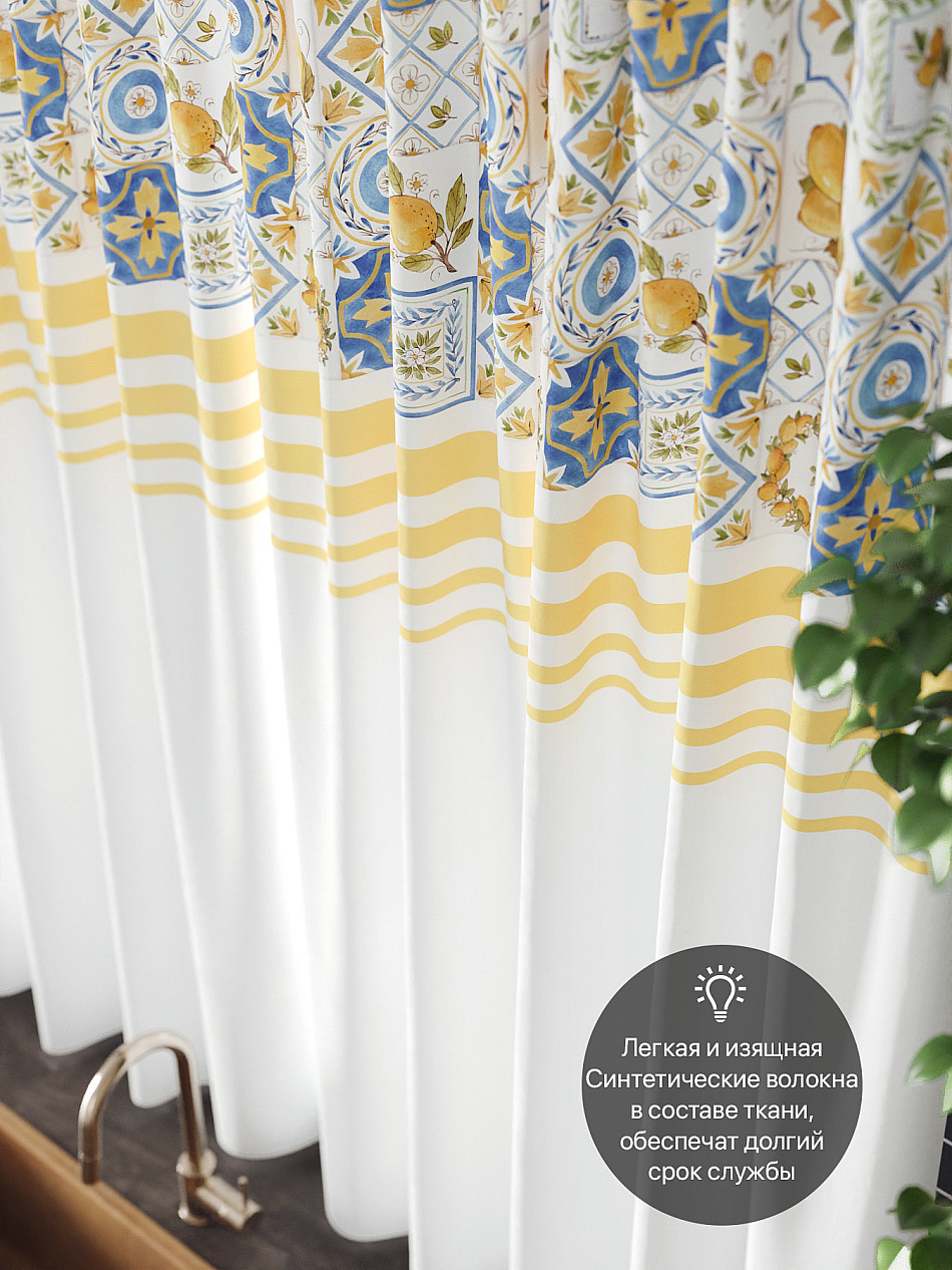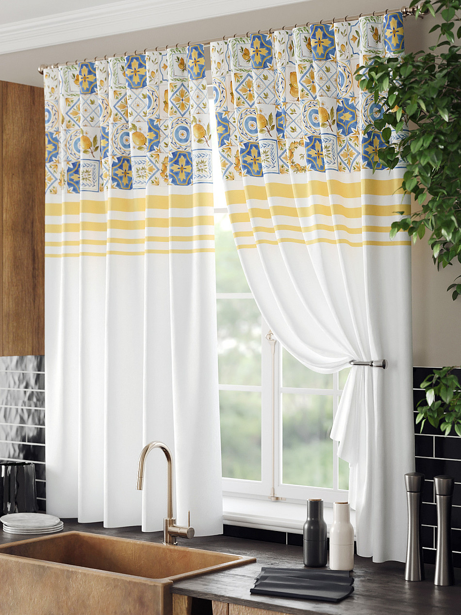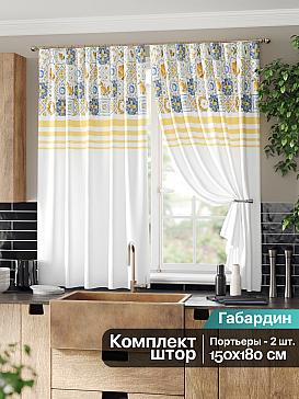 Комплект штор из легкой портьерной ткани (габардин) оформлен печатным рисунком. Печатный рисунок дает широкие возможности обновить интерьер фактически нет требуя ремонта за счет огромного выбора. Ткани с печатным рисунком безопасны и не содержат токсичных веществ. Не смотря на то что, материал легкий, он имеет высокую плотность, мало загрязнятся и не требует особого ухода даже после стирки, что важно для кухонных занавесок. Шторы не выцветают, не растягиваются, превосходно драпируются, образуя струящиеся складки. Прекрасное решение для создания красоты и уюта с помощью уникальных дизайнов.