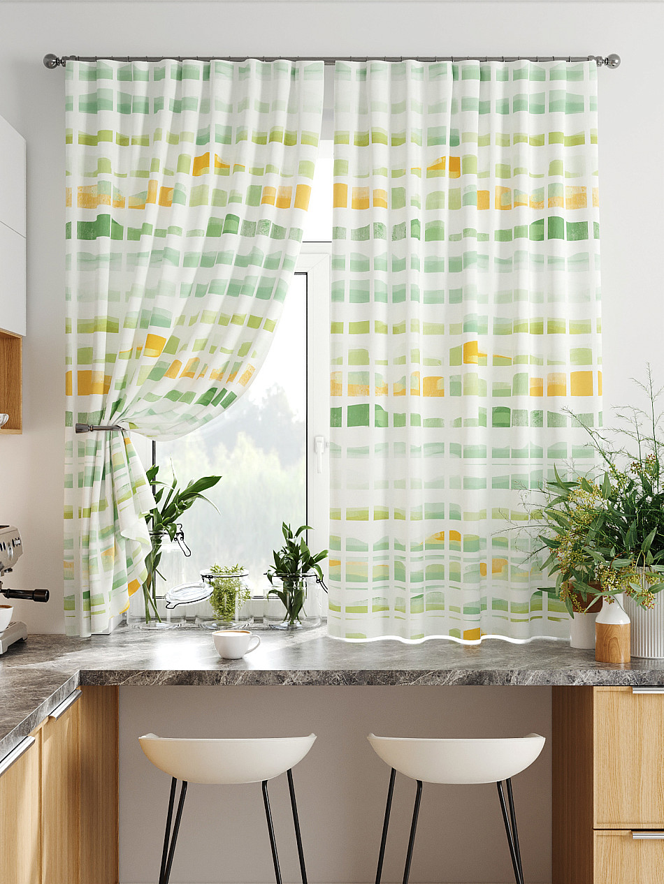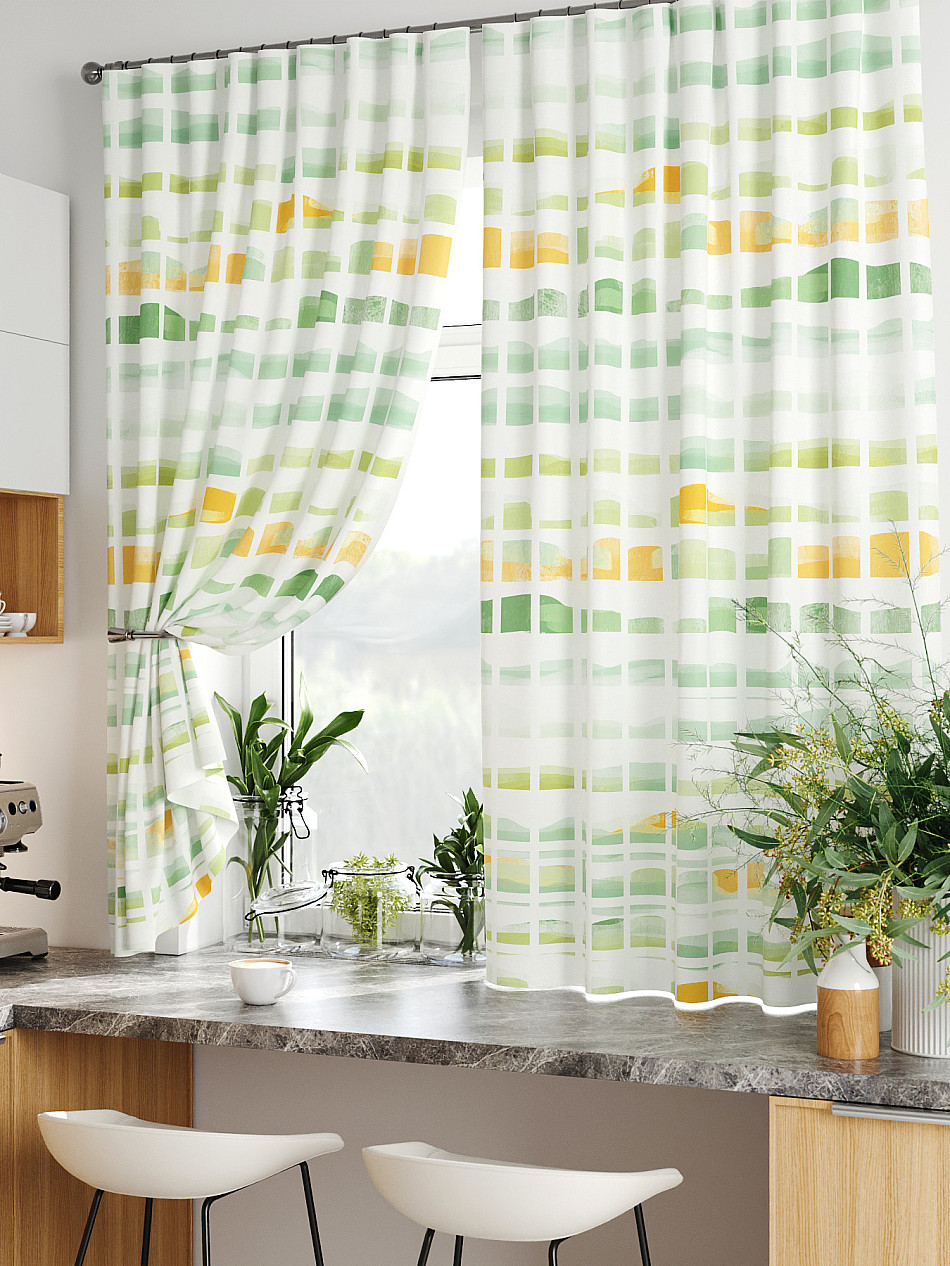 Комплект штор из легкой портьерной ткани (габардин) оформлен печатным рисунком. Печатный рисунок дает широкие возможности обновить интерьер фактически нет требуя ремонта за счет огромного выбора. Ткани с печатным рисунком безопасны и не содержат токсичных веществ. Не смотря на то что, материал легкий, он имеет высокую плотность, мало загрязнятся и не требует особого ухода даже после стирки, что важно для кухонных занавесок. Шторы не выцветают, не растягиваются, превосходно драпируются, образуя струящиеся складки. Прекрасное решение для создания красоты и уюта с помощью уникальных дизайнов.