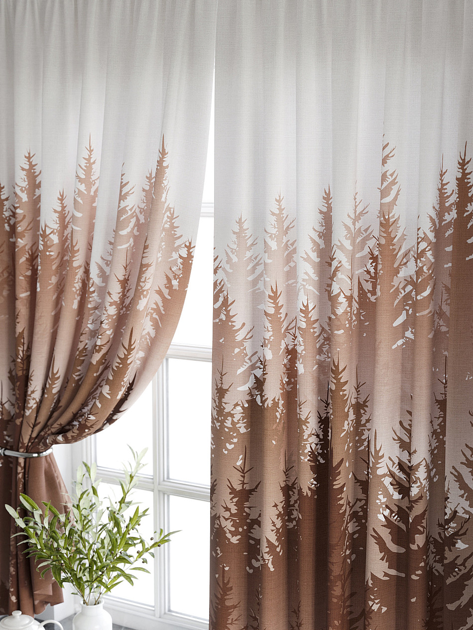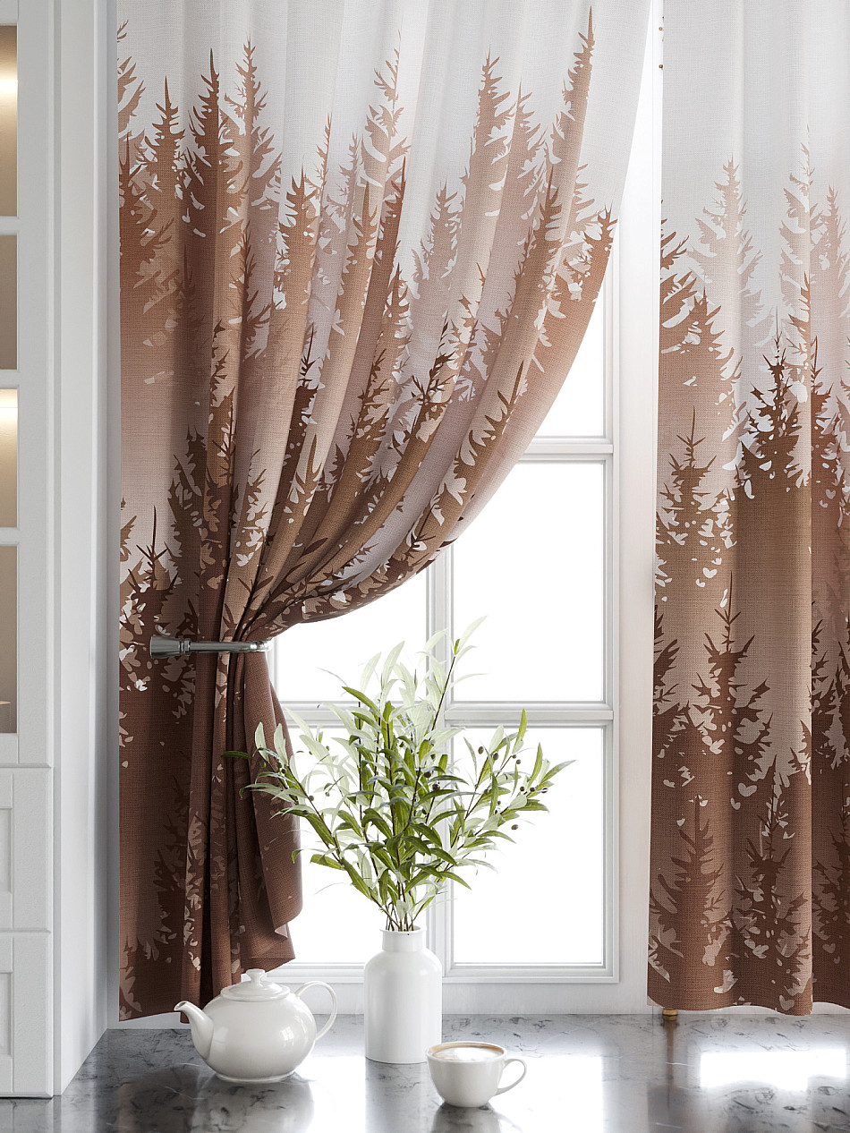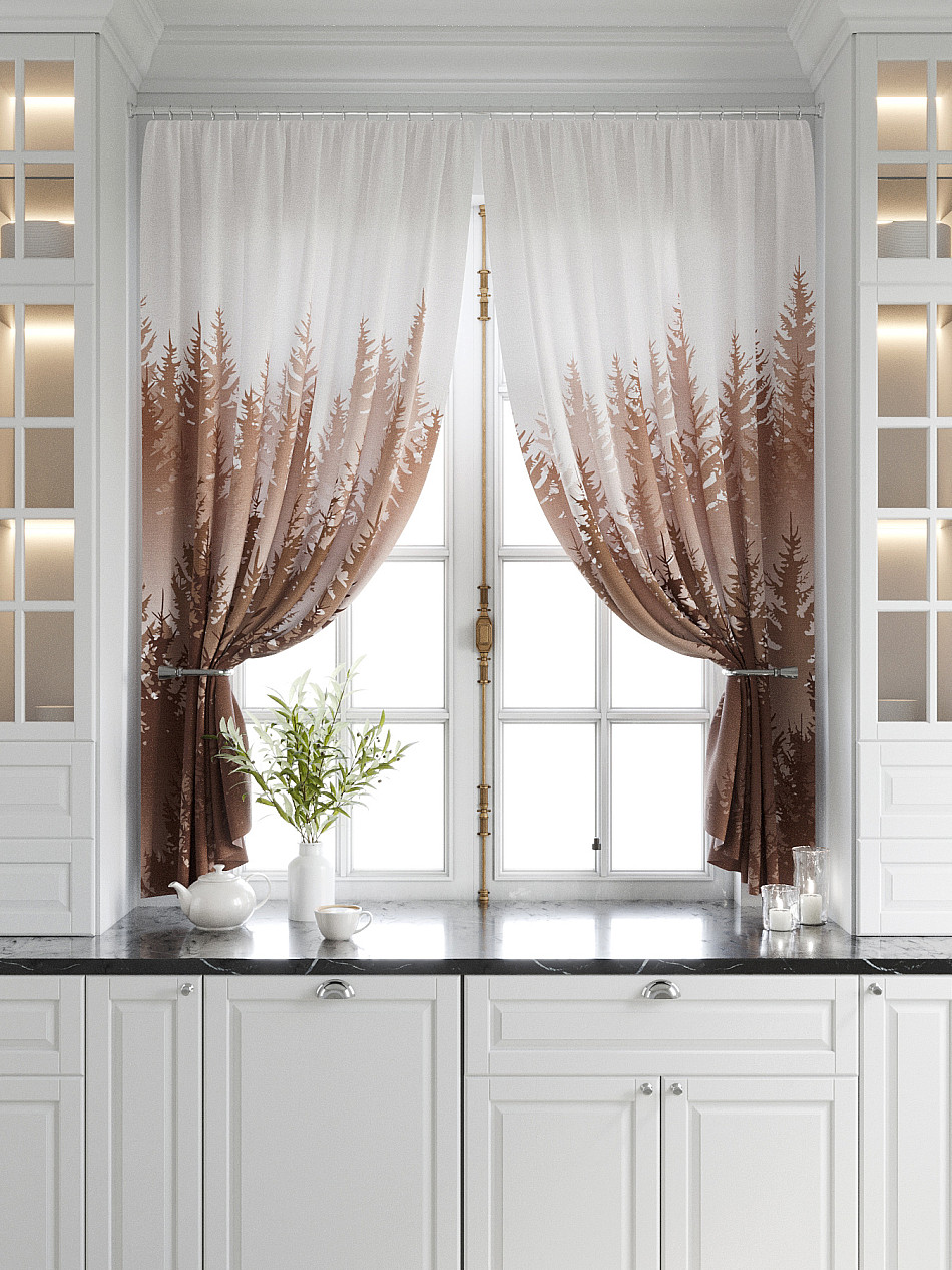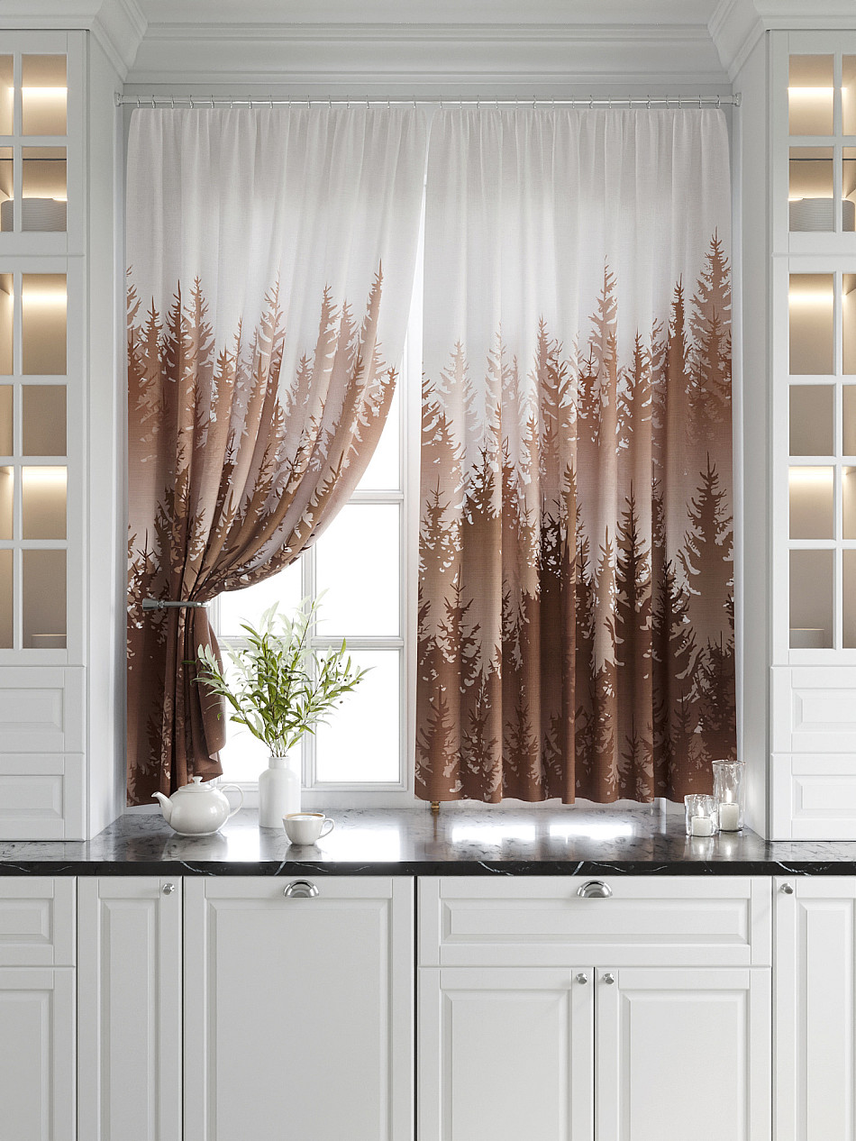 Комплект штор из легкой портьерной ткани (габардин) оформлен печатным рисунком. Печатный рисунок дает широкие возможности обновить интерьер фактически нет требуя ремонта за счет огромного выбора. Ткани с печатным рисунком безопасны и не содержат токсичных веществ. Не смотря на то что, материал легкий, он имеет высокую плотность, мало загрязнятся и не требует особого ухода даже после стирки, что важно для кухонных занавесок. Шторы не выцветают, не растягиваются, превосходно драпируются, образуя струящиеся складки. Прекрасное решение для создания красоты и уюта с помощью уникальных дизайнов.