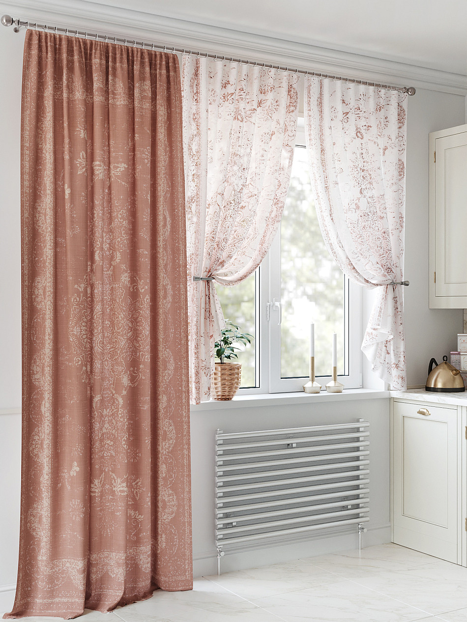 Портьера 150х250 см — 1 шт., вуаль 150х180 см — 2 шт. ( Уменьшить высоту ) Крепление: шторная лента (крючки), кулиска Подробнее