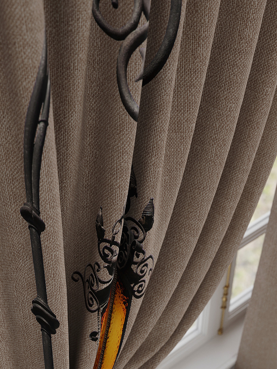 По верхнему краю портьер пришита шторная тесьма 6 см, с ее помощью затянув узелки от кордовых нитей с обеих сторон и стянув их до нужного размера можно сформировать округлые складки, далее вставить крючки в кармашки и повесить на карниз. Обязательно проверьте кордовые нити – они должны быть надежно завязаны, в противном случае во время стягивания они могут вылететь. Шторная тесьма имеет два ряда кармашков, с их помощью можно регулировать не только длину, но и ширину. Такое крепление подходит для всех типов карнизов.