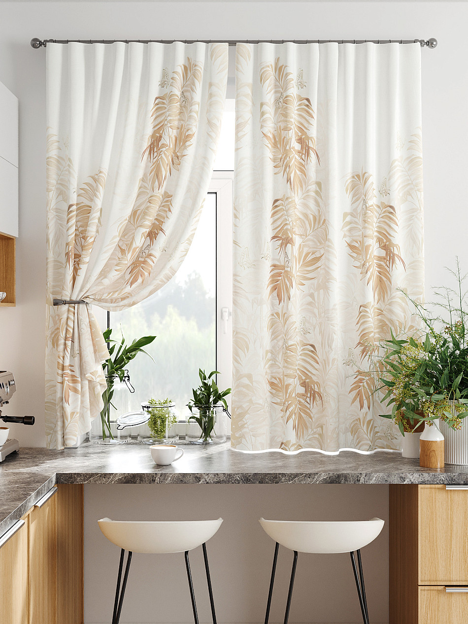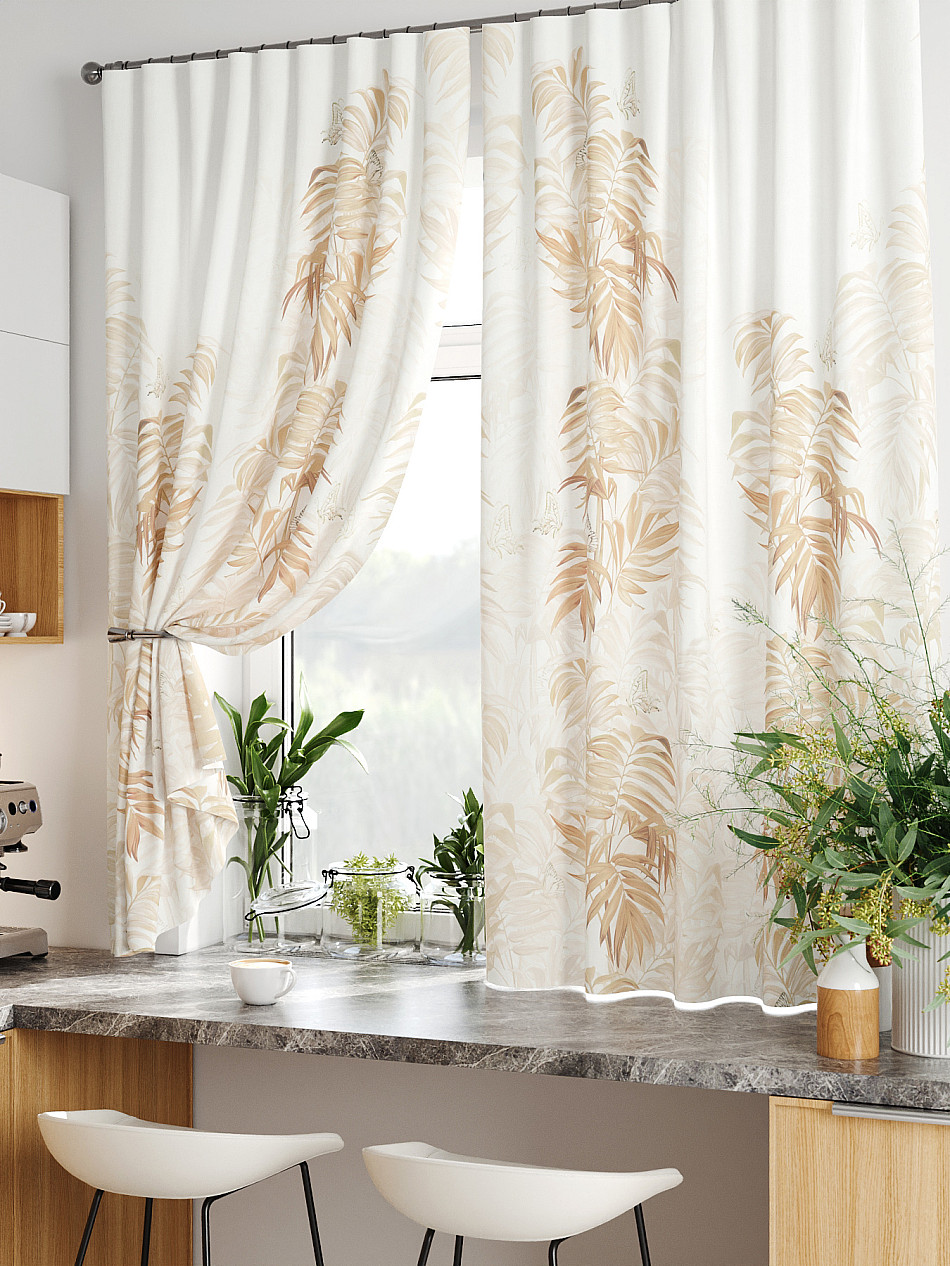 Комплект штор из легкой портьерной ткани (габардин) оформлен печатным рисунком. Печатный рисунок дает широкие возможности обновить интерьер фактически нет требуя ремонта за счет огромного выбора. Ткани с печатным рисунком безопасны и не содержат токсичных веществ. Не смотря на то что, материал легкий, он имеет высокую плотность, мало загрязнятся и не требует особого ухода даже после стирки, что важно для кухонных занавесок. Шторы не выцветают, не растягиваются, превосходно драпируются, образуя струящиеся складки. Прекрасное решение для создания красоты и уюта с помощью уникальных дизайнов.