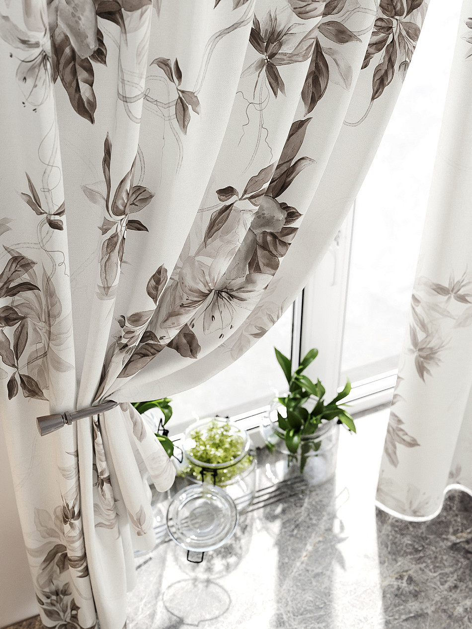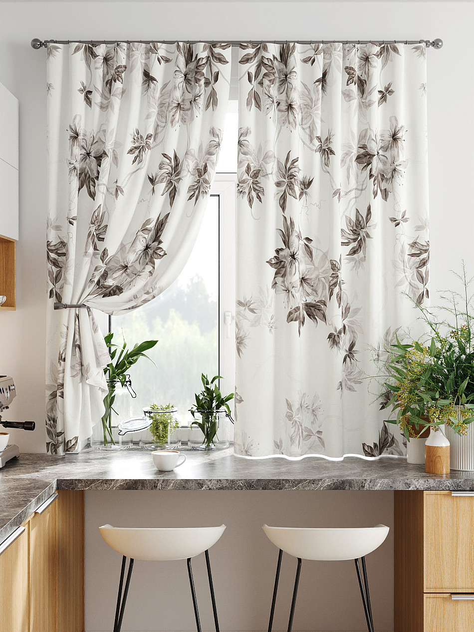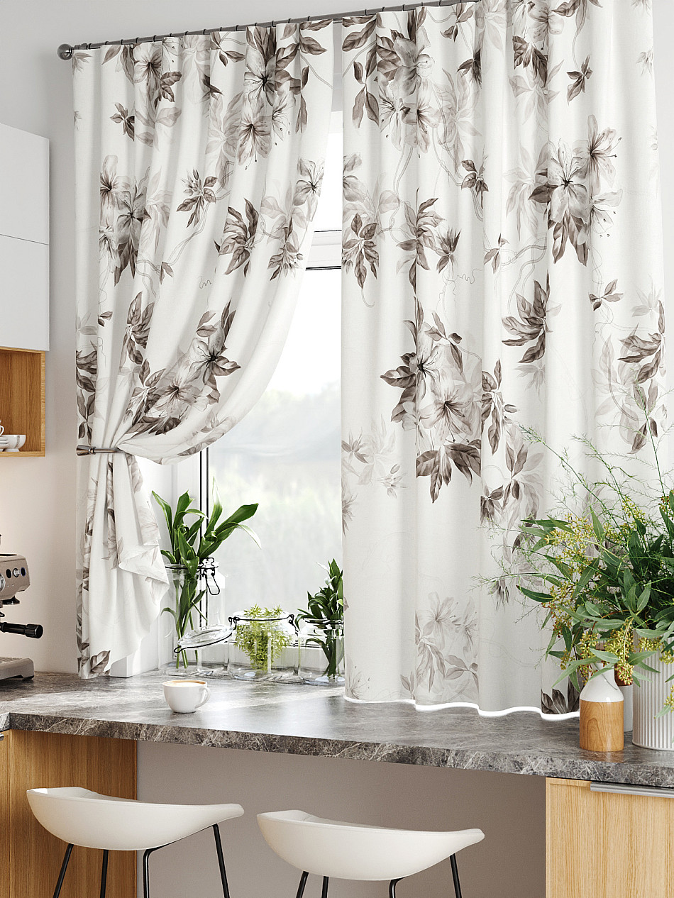 Комплект штор из легкой портьерной ткани (габардин) оформлен печатным рисунком. Печатный рисунок дает широкие возможности обновить интерьер фактически нет требуя ремонта за счет огромного выбора. Ткани с печатным рисунком безопасны и не содержат токсичных веществ. Не смотря на то что, материал легкий, он имеет высокую плотность, мало загрязнятся и не требует особого ухода даже после стирки, что важно для кухонных занавесок. Шторы не выцветают, не растягиваются, превосходно драпируются, образуя струящиеся складки. Прекрасное решение для создания красоты и уюта с помощью уникальных дизайнов.