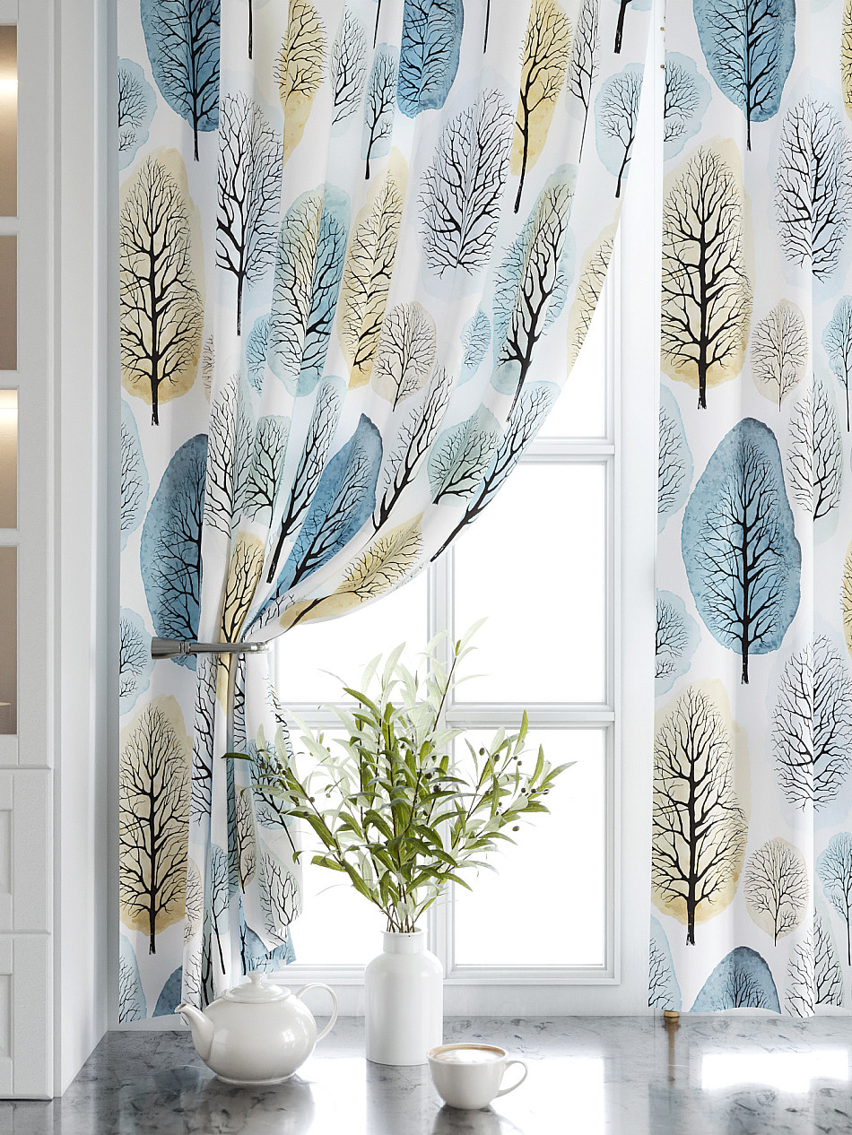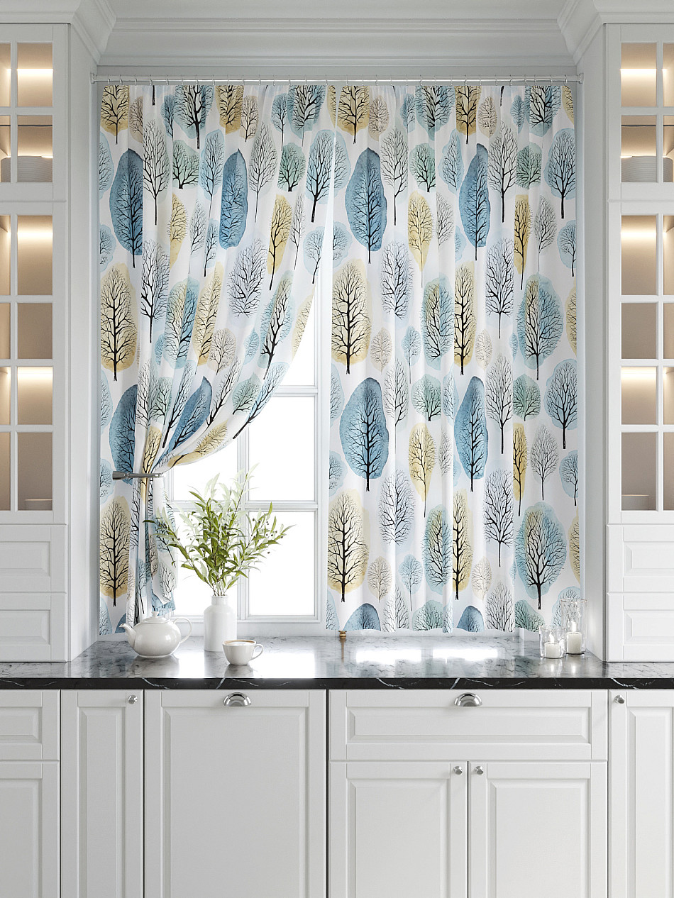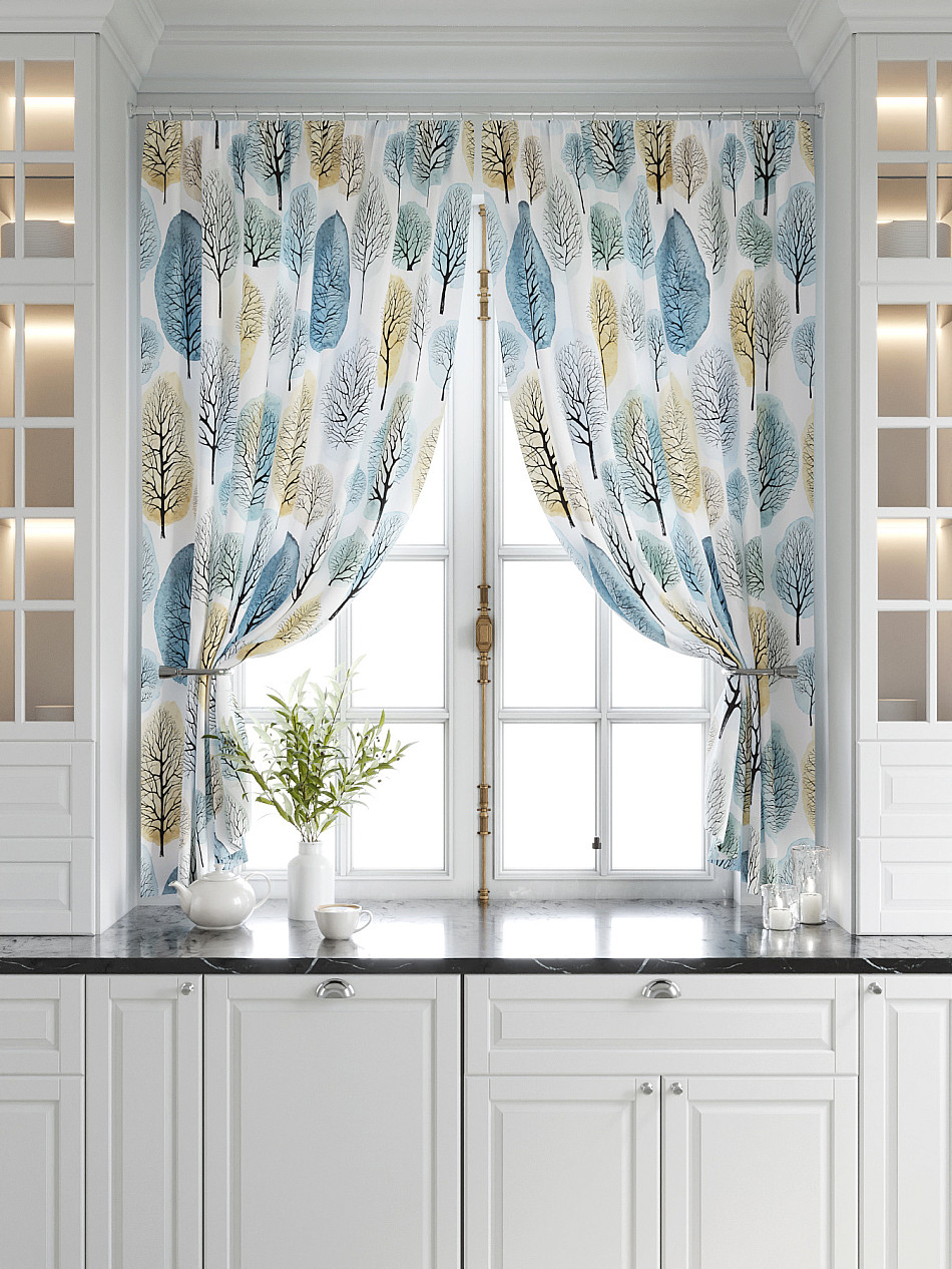 Комплект штор из легкой портьерной ткани (габардин) оформлен печатным рисунком. Печатный рисунок дает широкие возможности обновить интерьер фактически нет требуя ремонта за счет огромного выбора. Ткани с печатным рисунком безопасны и не содержат токсичных веществ. Не смотря на то что, материал легкий, он имеет высокую плотность, мало загрязнятся и не требует особого ухода даже после стирки, что важно для кухонных занавесок. Шторы не выцветают, не растягиваются, превосходно драпируются, образуя струящиеся складки. Прекрасное решение для создания красоты и уюта с помощью уникальных дизайнов.
