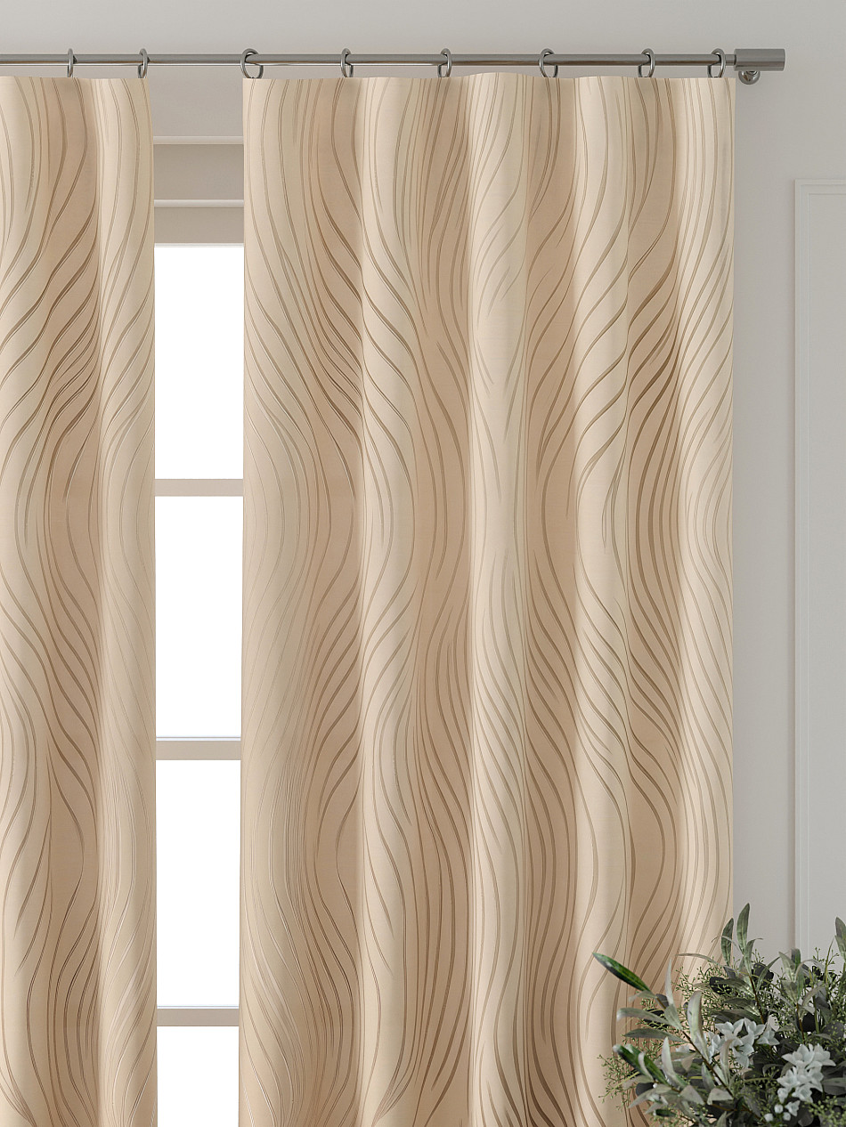 По верхнему краю портьер пришита шторная тесьма 6 см, с ее помощью затянув узелки от кордовых нитей с обеих сторон и стянув их до нужного размера можно сформировать округлые складки, далее вставить крючки в кармашки и повесить на карниз. Обязательно проверьте кордовые нити – они должны быть надежно завязаны, в противном случае во время стягивания они могут вылететь. Шторная тесьма имеет два ряда кармашков, с их помощью можно регулировать не только длину, но и ширину. Такое крепление подходит для всех типов карнизов.