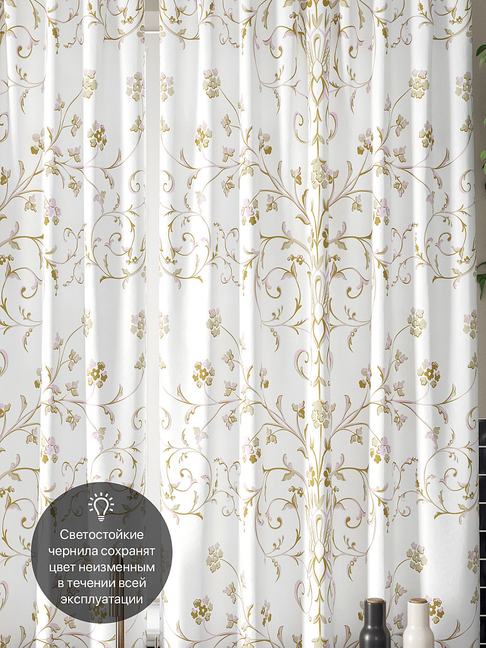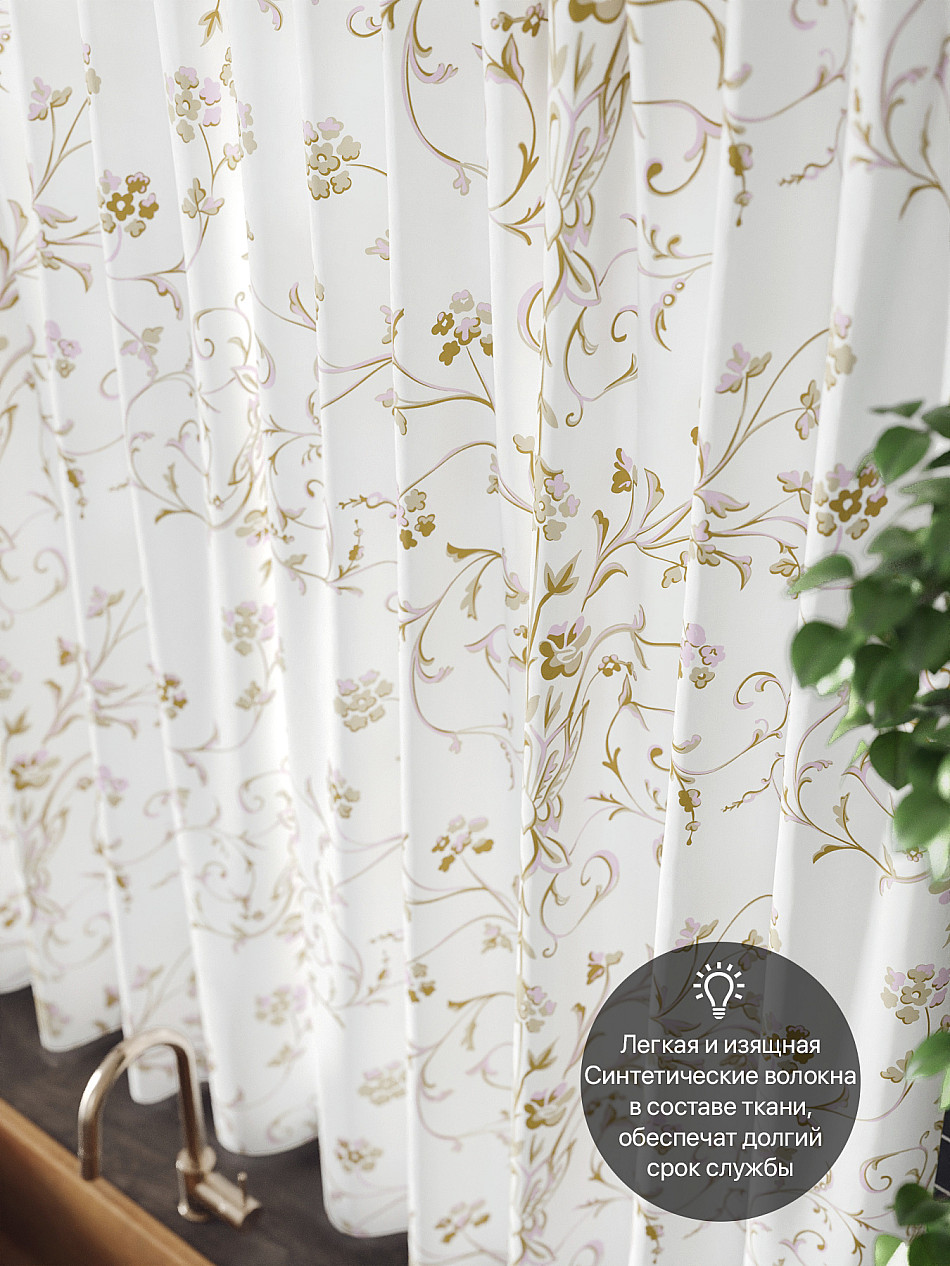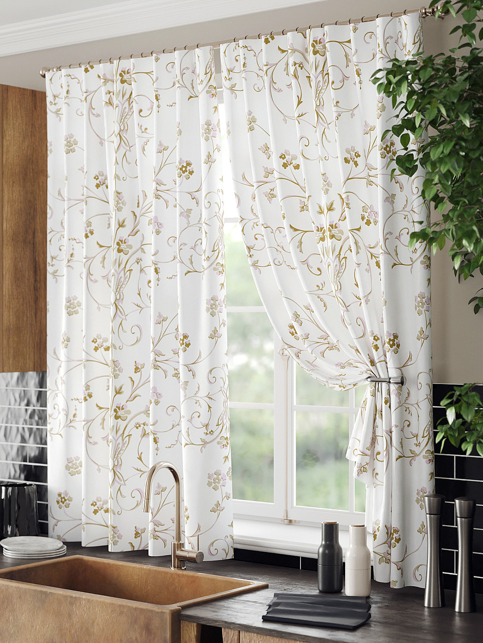 Комплект штор из легкой портьерной ткани (габардин) оформлен печатным рисунком. Печатный рисунок дает широкие возможности обновить интерьер фактически нет требуя ремонта за счет огромного выбора. Ткани с печатным рисунком безопасны и не содержат токсичных веществ. Не смотря на то что, материал легкий, он имеет высокую плотность, мало загрязнятся и не требует особого ухода даже после стирки, что важно для кухонных занавесок. Шторы не выцветают, не растягиваются, превосходно драпируются, образуя струящиеся складки. Прекрасное решение для создания красоты и уюта с помощью уникальных дизайнов.