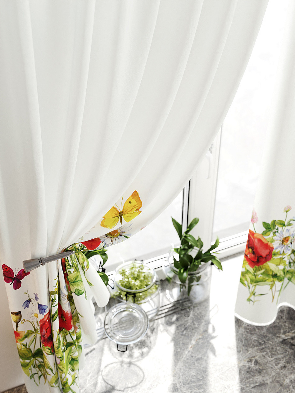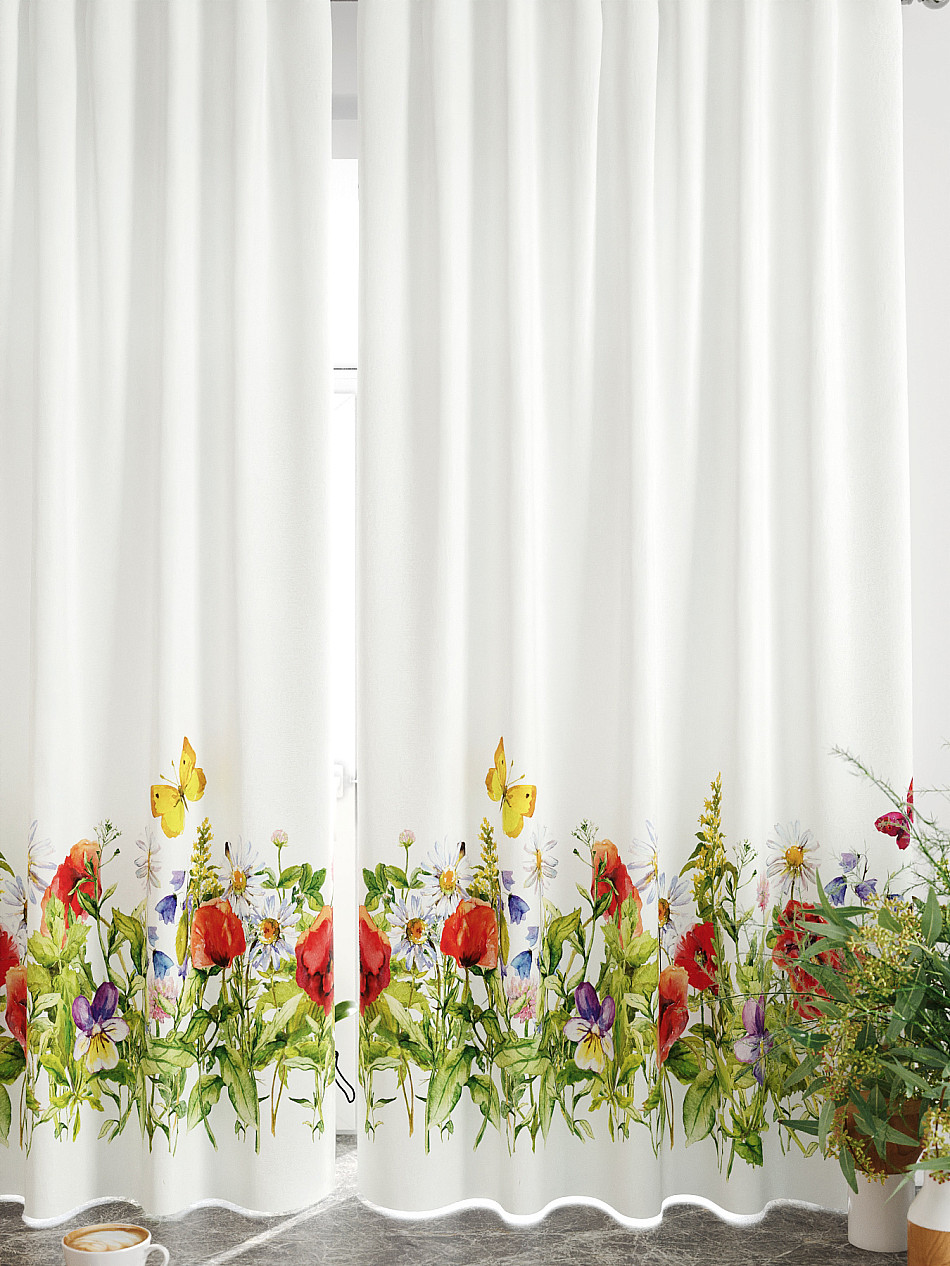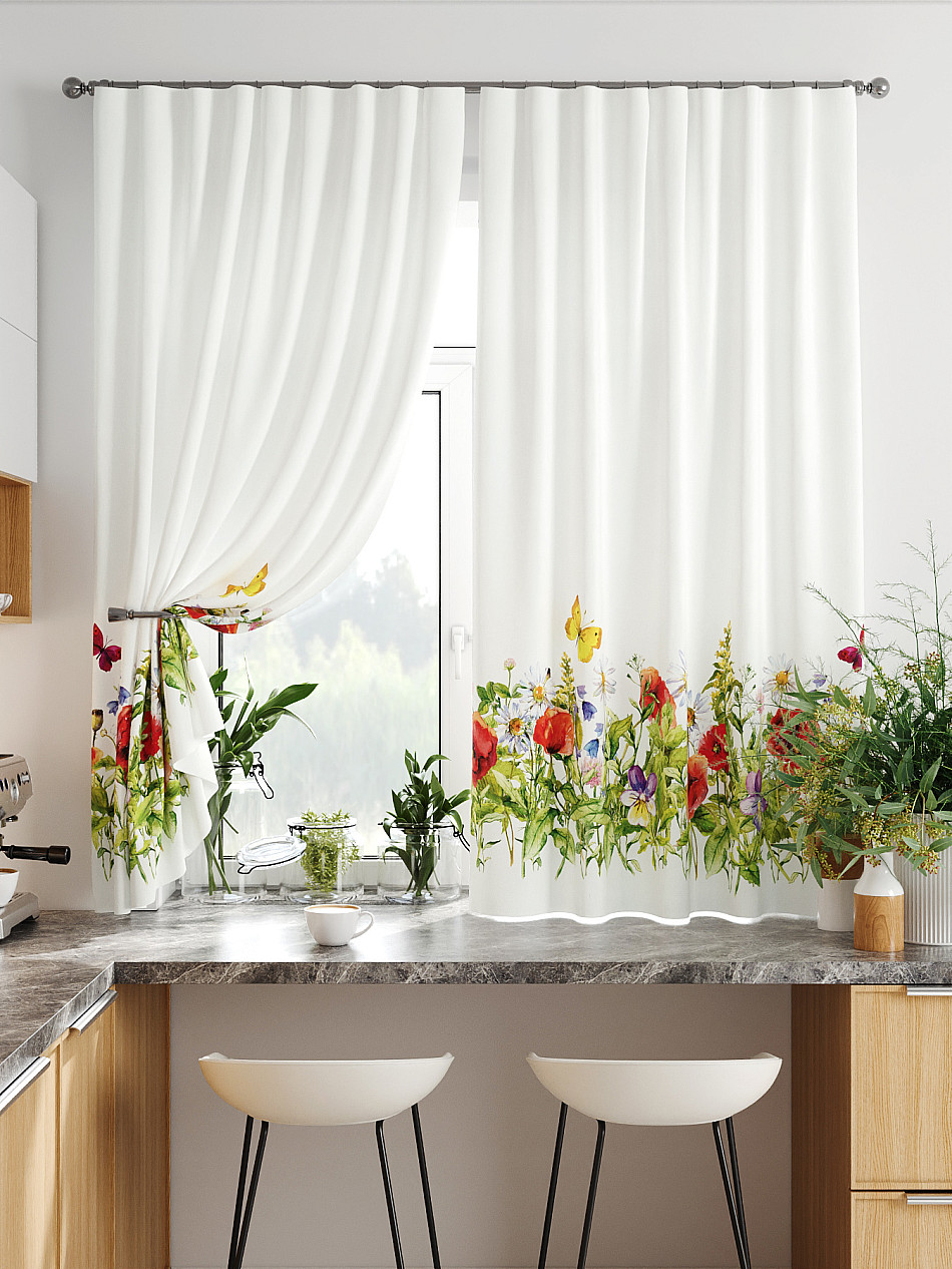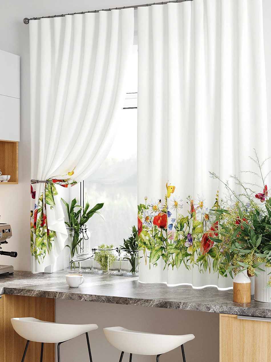 Комплект штор из легкой портьерной ткани (габардин) оформлен печатным рисунком. Печатный рисунок дает широкие возможности обновить интерьер фактически нет требуя ремонта за счет огромного выбора. Ткани с печатным рисунком безопасны и не содержат токсичных веществ. Не смотря на то что, материал легкий, он имеет высокую плотность, мало загрязнятся и не требует особого ухода даже после стирки, что важно для кухонных занавесок. Шторы не выцветают, не растягиваются, превосходно драпируются, образуя струящиеся складки. Прекрасное решение для создания красоты и уюта с помощью уникальных дизайнов.