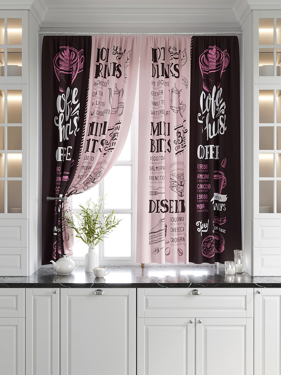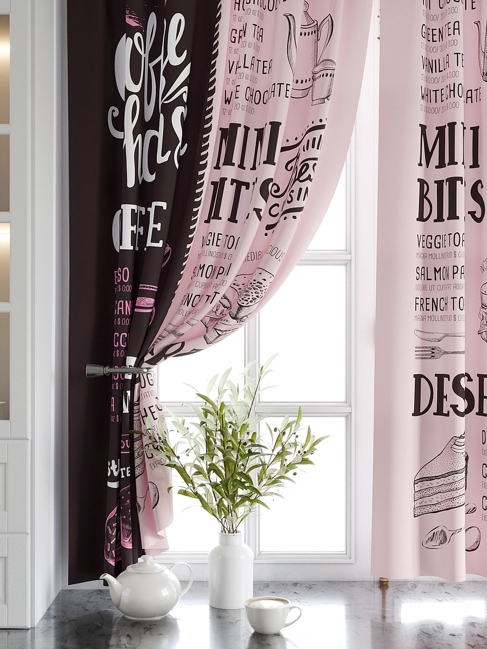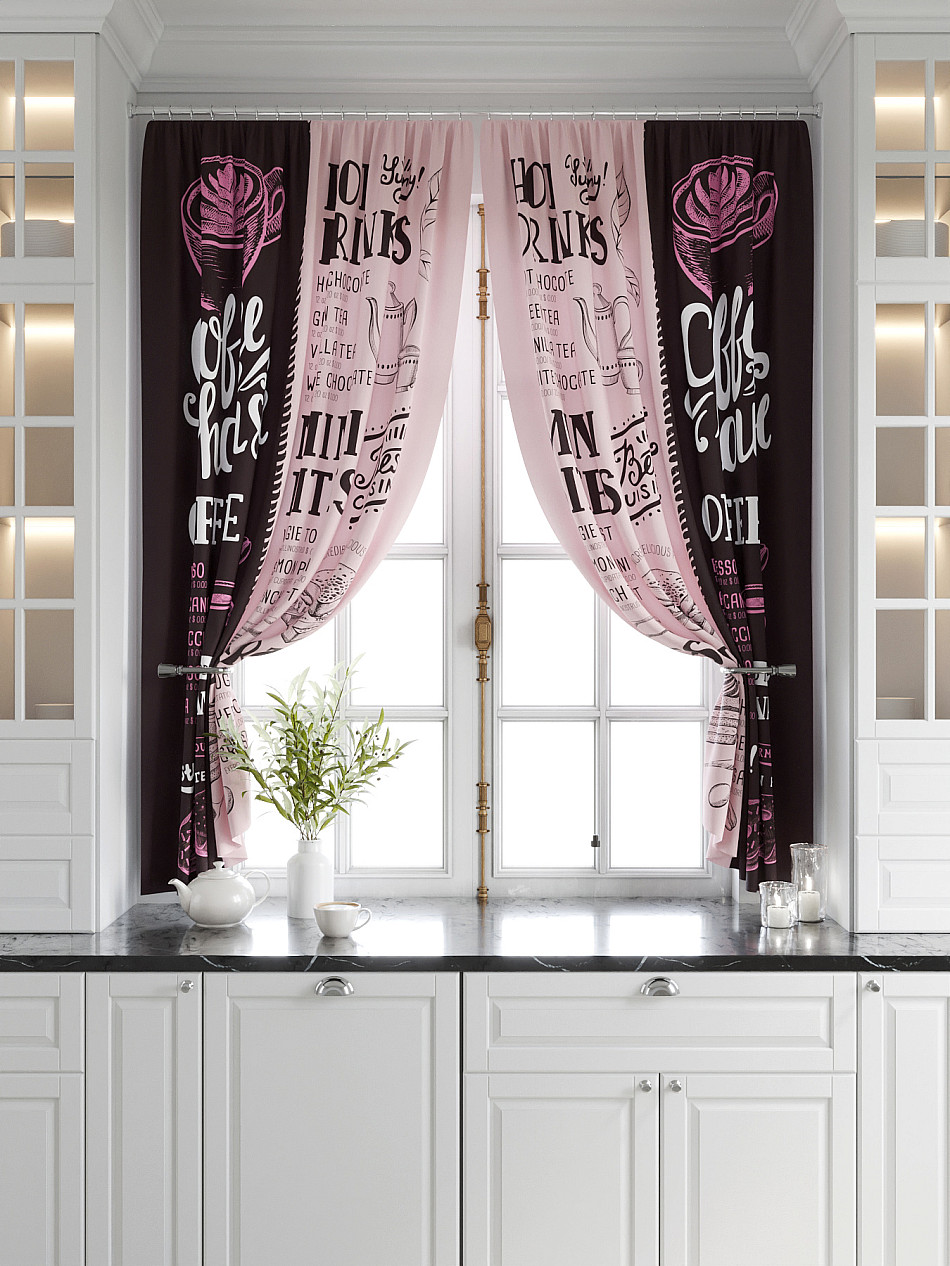 Комплект штор из легкой портьерной ткани (габардин) оформлен печатным рисунком. Печатный рисунок дает широкие возможности обновить интерьер фактически нет требуя ремонта за счет огромного выбора. Ткани с печатным рисунком безопасны и не содержат токсичных веществ. Не смотря на то что, материал легкий, он имеет высокую плотность, мало загрязнятся и не требует особого ухода даже после стирки, что важно для кухонных занавесок. Шторы не выцветают, не растягиваются, превосходно драпируются, образуя струящиеся складки. Прекрасное решение для создания красоты и уюта с помощью уникальных дизайнов.