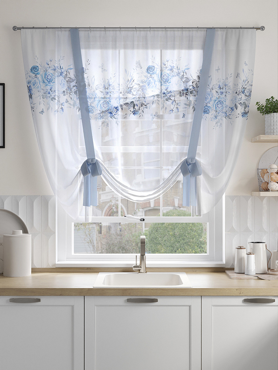 Прекрасная штора - тюль для кухни. Рисунок очень красивый, акварельный. Шторная лента уже пришита. -