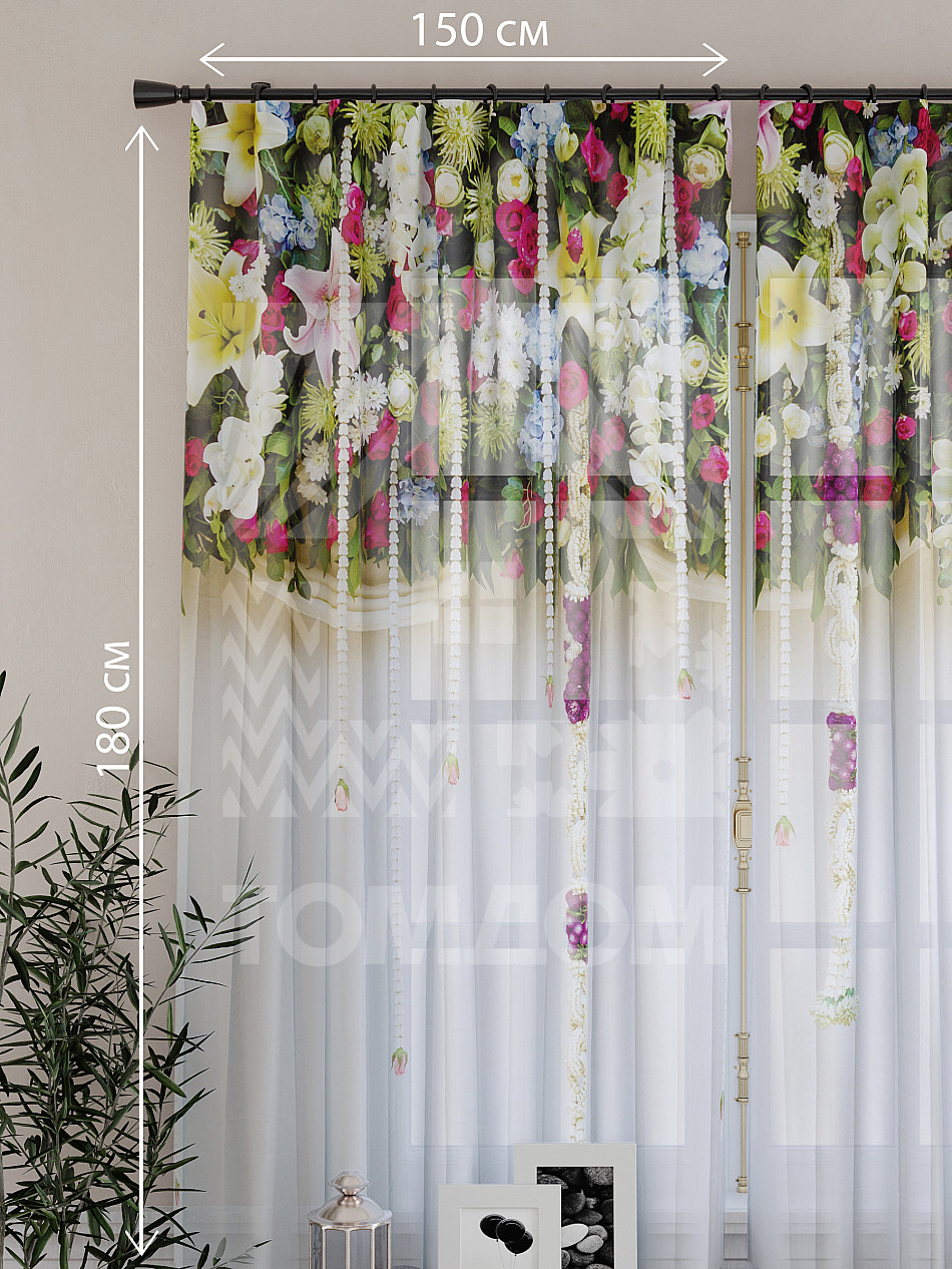 Ширина одного тюля без сборки 150 см, высота 180 см.