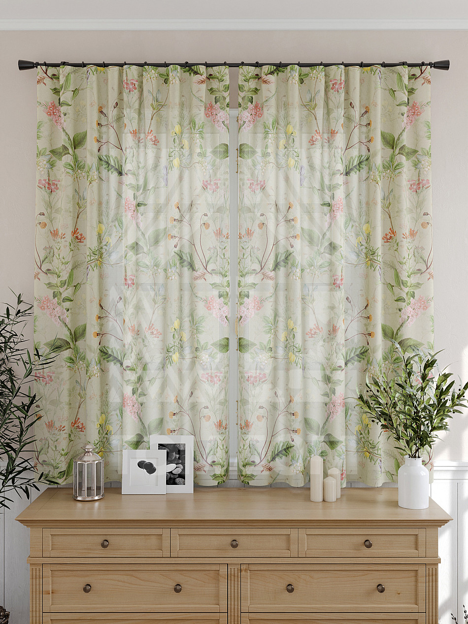 Тюль 2 шт. Подхват - доп.услуга. Легкая основа (вуаль) оформлена принтом. Вуаль с матовой полупрозрачной текстурой. Отличается особым шиком, идеально подходит для создания воздушных штор. Придает ощущение свежести, хорошо пропускает воздух. Ткань неприхотлива в уходе, хорошо стирается без разрушения волокон с течением времени за счет высокого кручения нитей.