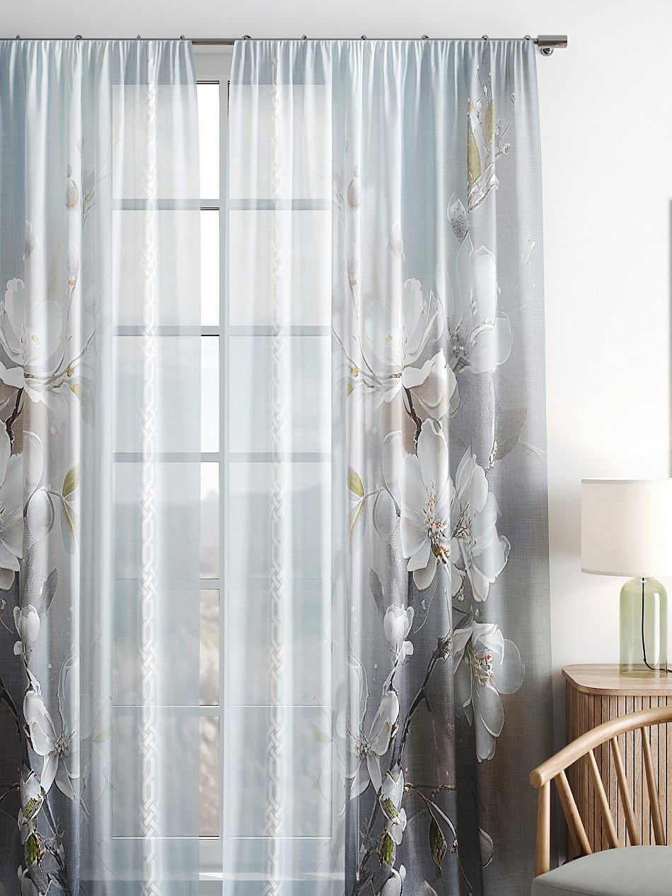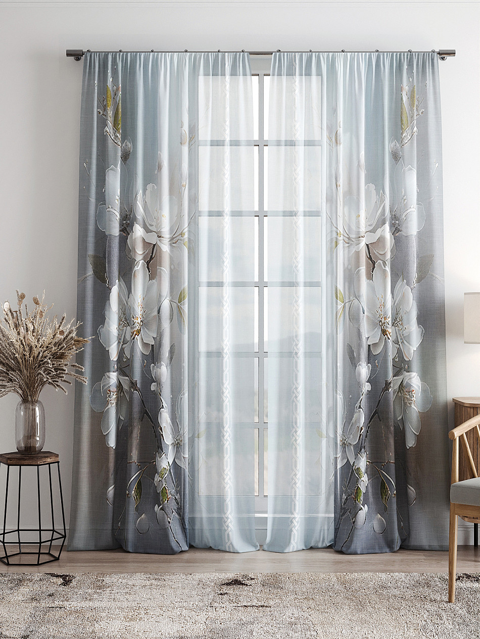 Тюль 2 шт. Легкая основа (вуаль) оформлена фотопечатью. Вуаль с матовой полупрозрачной текстурой. Отличается особым шиком, идеально подходит для создания воздушных штор. Придает ощущение свежести, хорошо пропускает воздух. Ткань неприхотлива в уходе, хорошо стирается без разрушения волокон с течением времени за счет высокого кручения нитей.