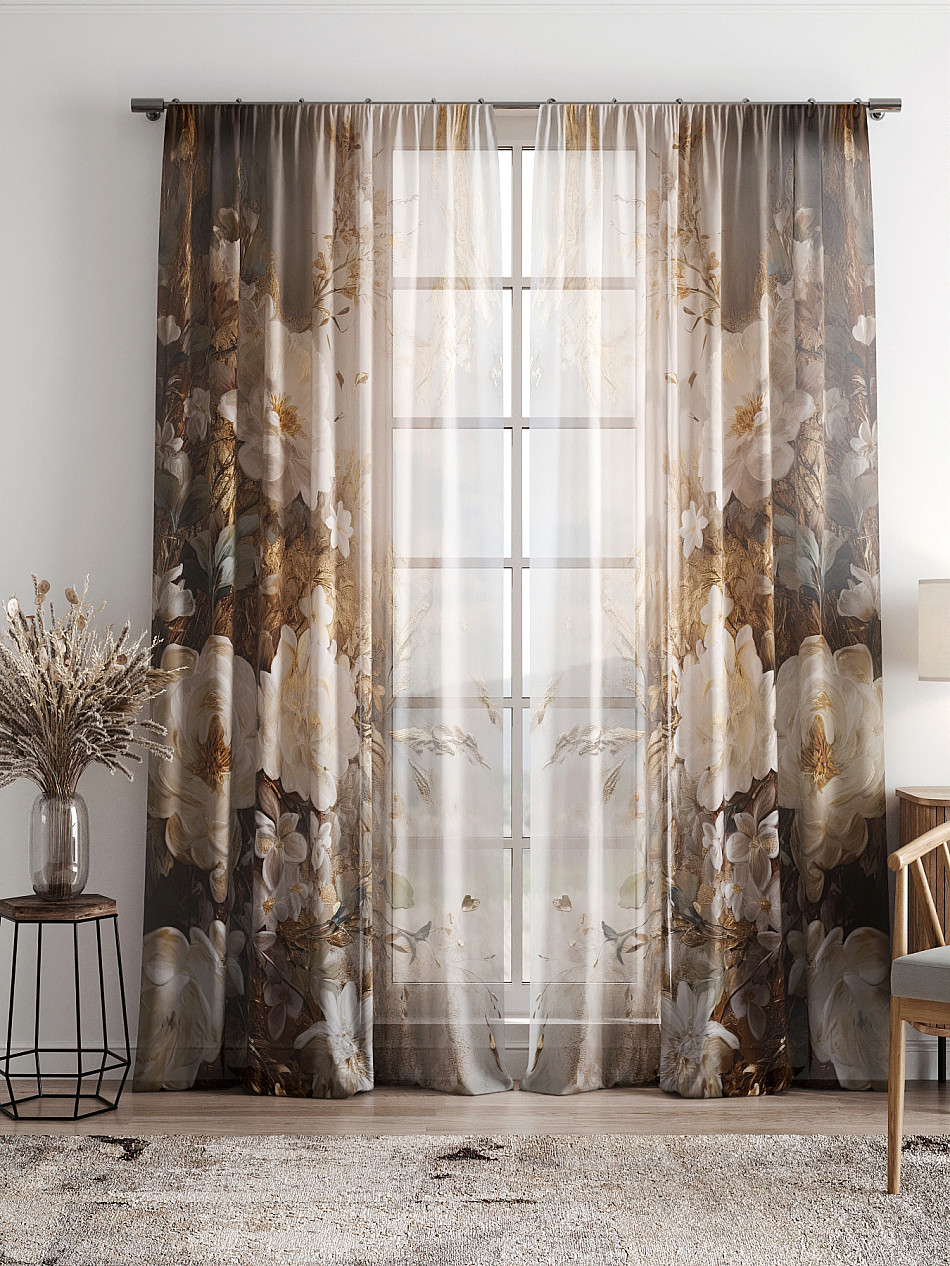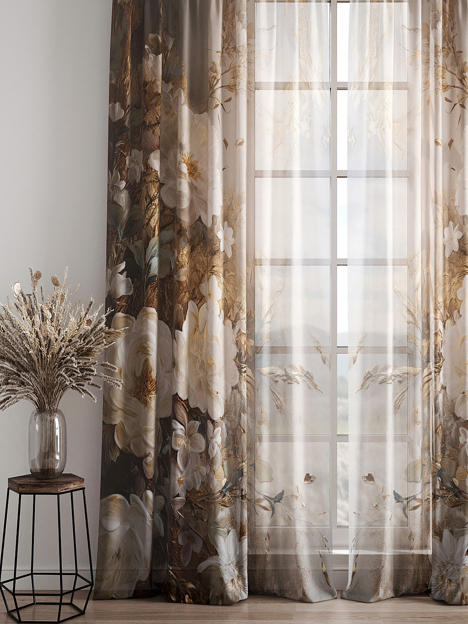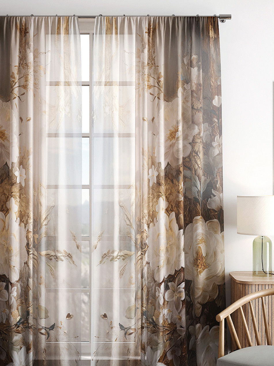 Тюль 2 шт. Легкая основа (вуаль) оформлена фотопечатью. Вуаль с матовой полупрозрачной текстурой. Отличается особым шиком, идеально подходит для создания воздушных штор. Придает ощущение свежести, хорошо пропускает воздух. Ткань неприхотлива в уходе, хорошо стирается без разрушения волокон с течением времени за счет высокого кручения нитей.