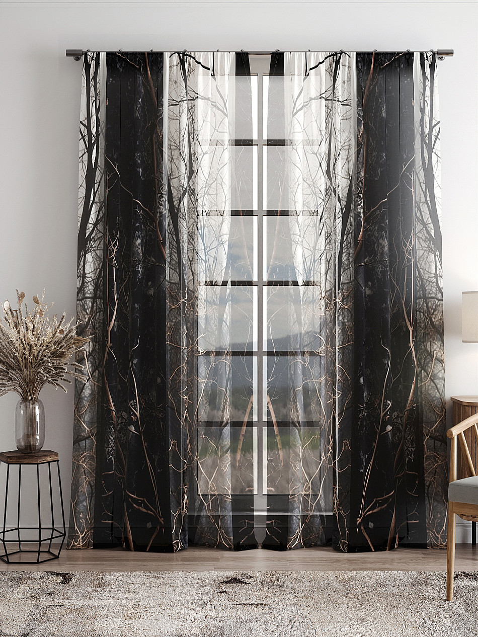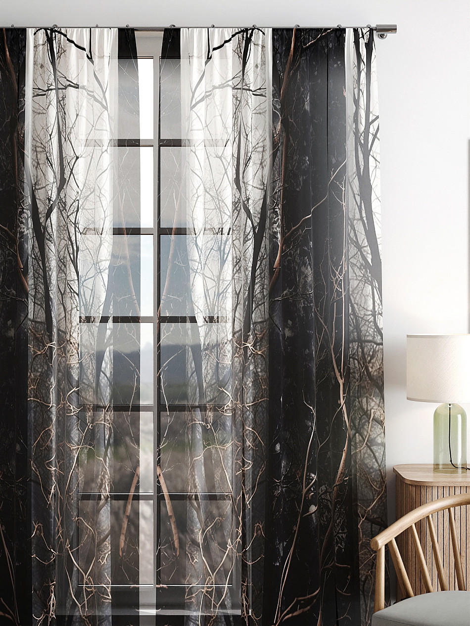 Тюль 2 шт. Легкая основа (вуаль) оформлена фотопечатью. Вуаль с матовой полупрозрачной текстурой. Отличается особым шиком, идеально подходит для создания воздушных штор. Придает ощущение свежести, хорошо пропускает воздух. Ткань неприхотлива в уходе, хорошо стирается без разрушения волокон с течением времени за счет высокого кручения нитей.