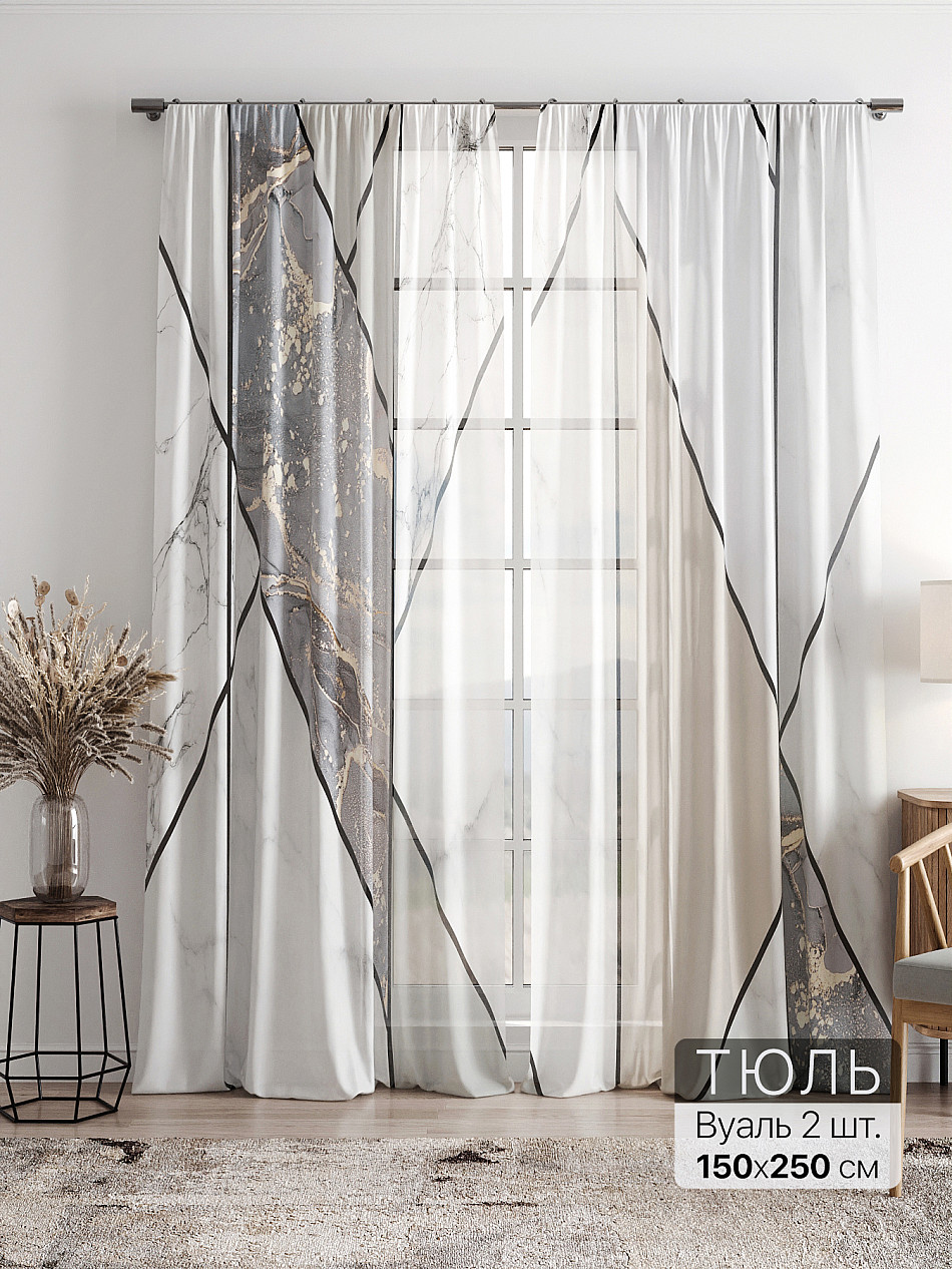 Тюль 2 шт. Легкая основа (вуаль) оформлена фотопечатью. Вуаль с матовой полупрозрачной текстурой. Отличается особым шиком, идеально подходит для создания воздушных штор. Придает ощущение свежести, хорошо пропускает воздух. Ткань неприхотлива в уходе, хорошо стирается без разрушения волокон с течением времени за счет высокого кручения нитей.
