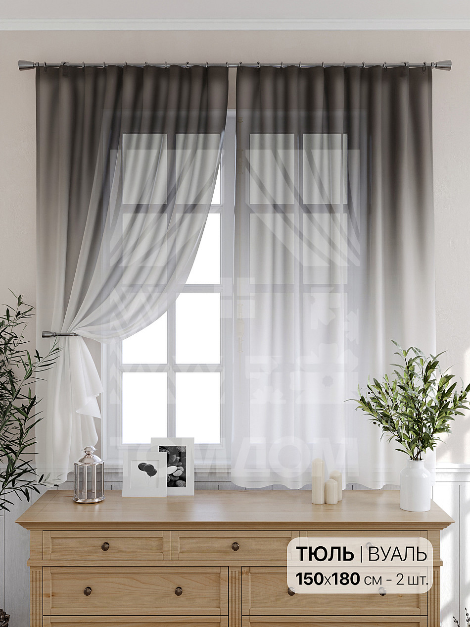 Вуаль – невесомая, практически прозрачная и очень нежная ткань, которая прекрасно смотрится в любом интерьере. Вуалевые шторы изысканны и элегантны как соло, так и в составе шторных ансамблей. Такие гардины придают окну воздушность, легко драпируются, мягко преломляют солнечные лучи и вносят изящество в оформление комнаты. Благодаря широкому ассортименту можно выбрать однотонные вуалевые шторы, либо с орнаментом, с аппликацией или вышивкой, в любом случае ваш выбор будет смотреться красиво и современно.