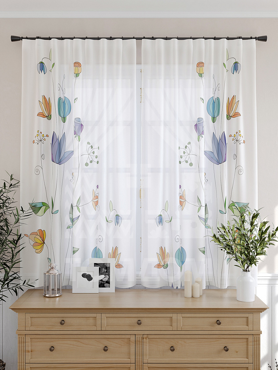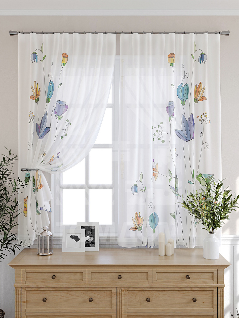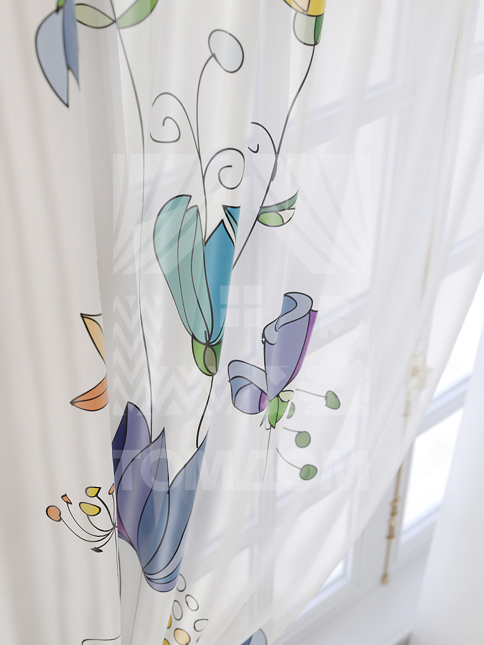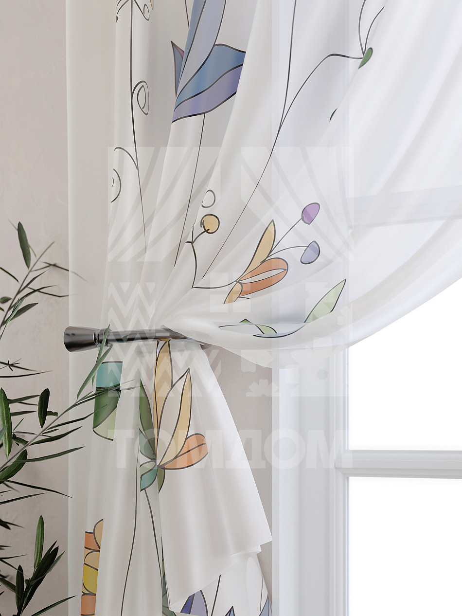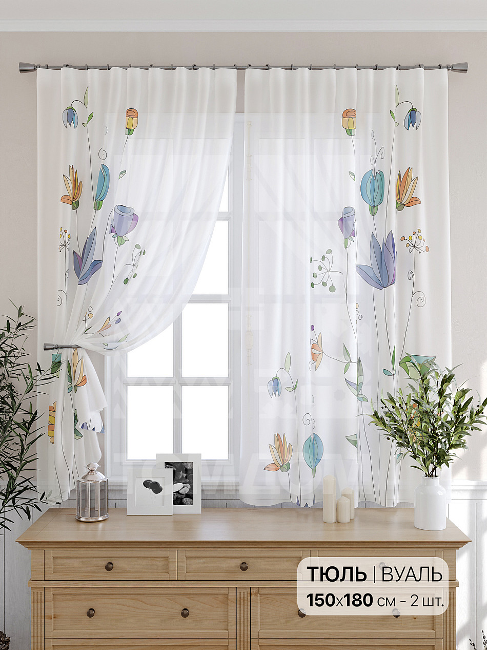 Тюль 2 шт. Подхват - доп.услуга. Легкая основа (вуаль) оформлена принтом. Вуаль с матовой полупрозрачной текстурой. Отличается особым шиком, идеально подходит для создания воздушных штор. Придает ощущение свежести, хорошо пропускает воздух. Ткань неприхотлива в уходе, хорошо стирается без разрушения волокон с течением времени за счет высокого кручения нитей.