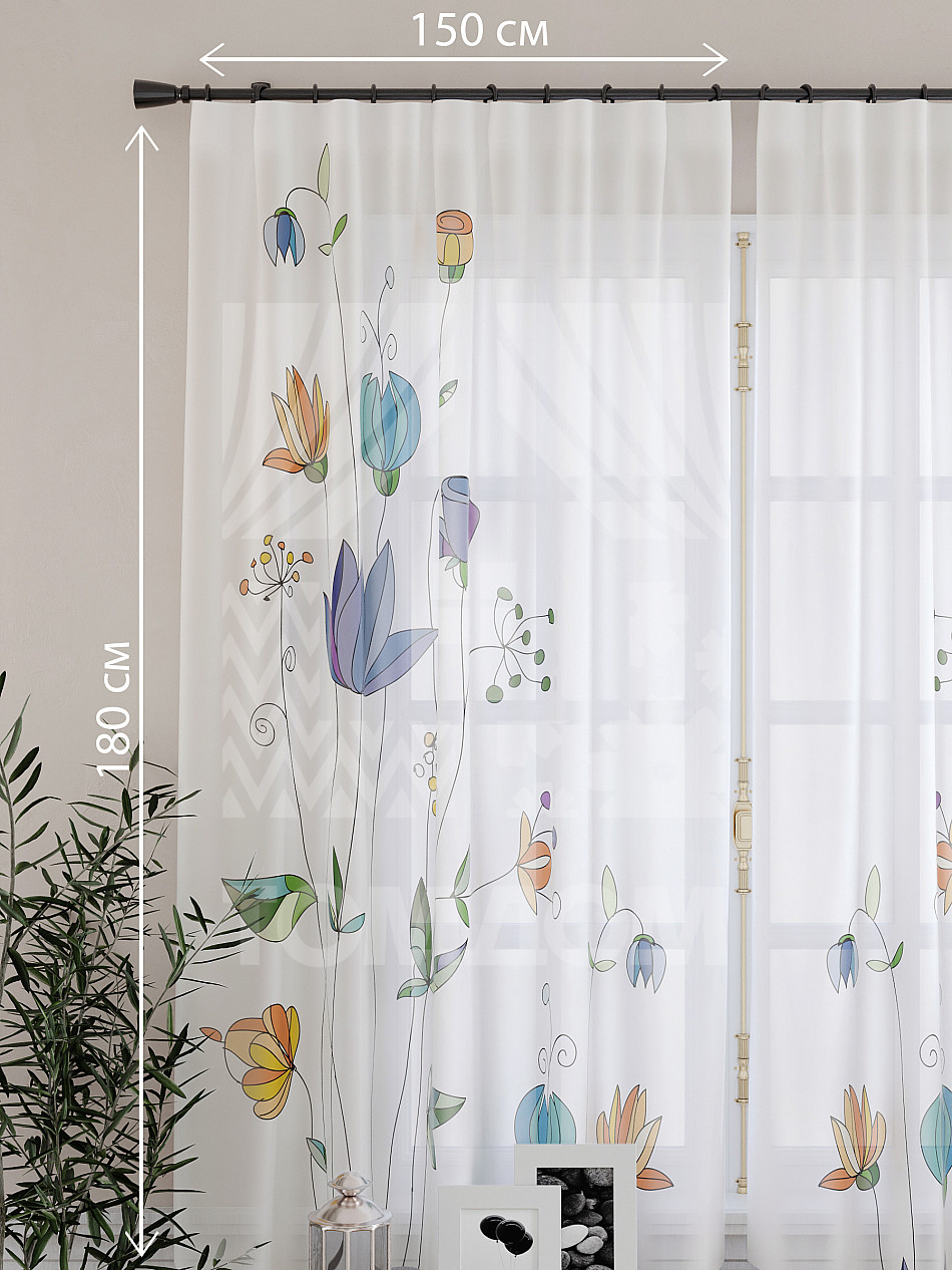 Ширина одного тюля без сборки 150 см, высота 180 см.