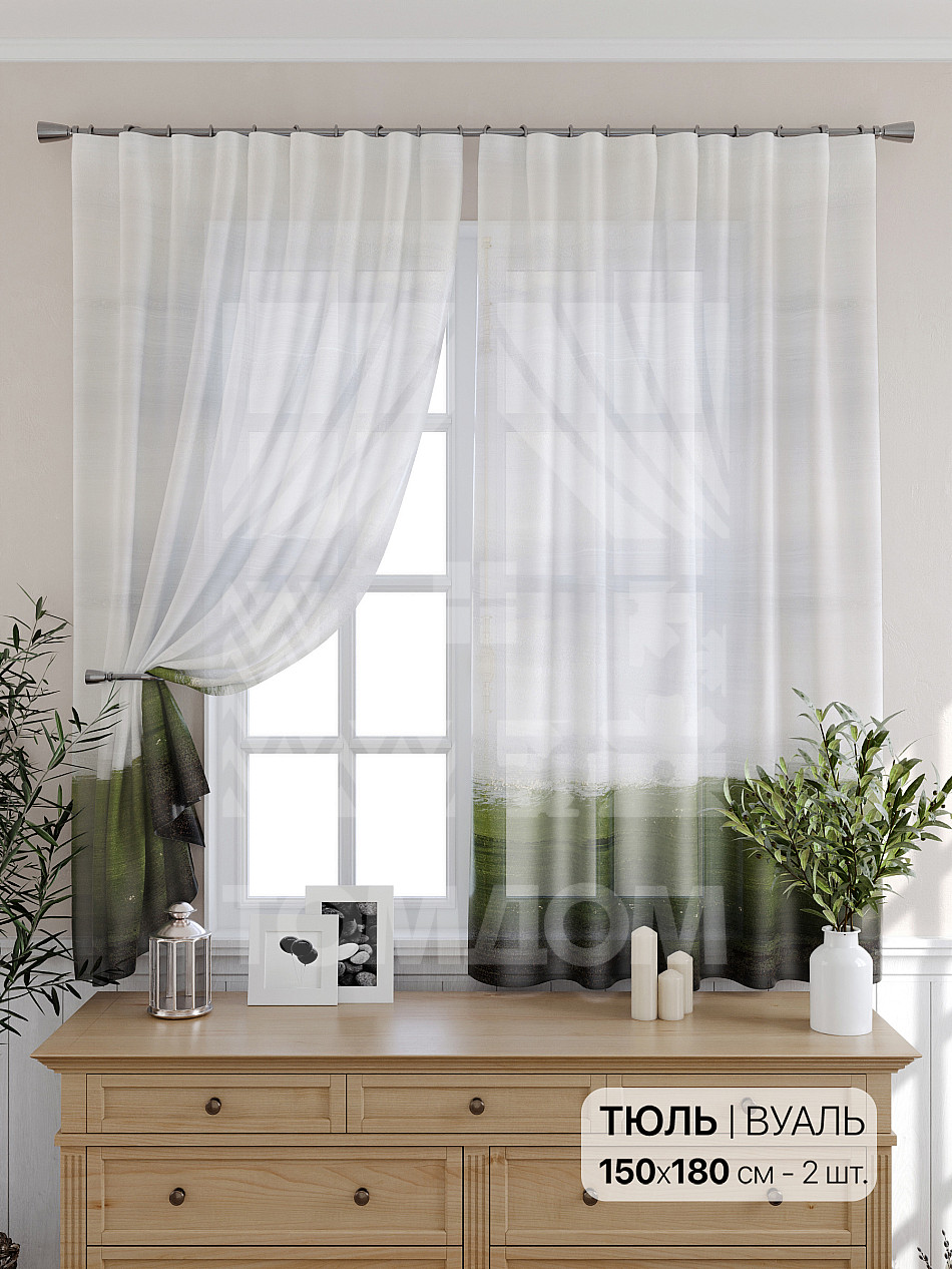 Тюль 2 шт. Подхват - доп.услуга. Легкая основа (вуаль) оформлена принтом. Вуаль с матовой полупрозрачной текстурой. Отличается особым шиком, идеально подходит для создания воздушных штор. Придает ощущение свежести, хорошо пропускает воздух. Ткань неприхотлива в уходе, хорошо стирается без разрушения волокон с течением времени за счет высокого кручения нитей.