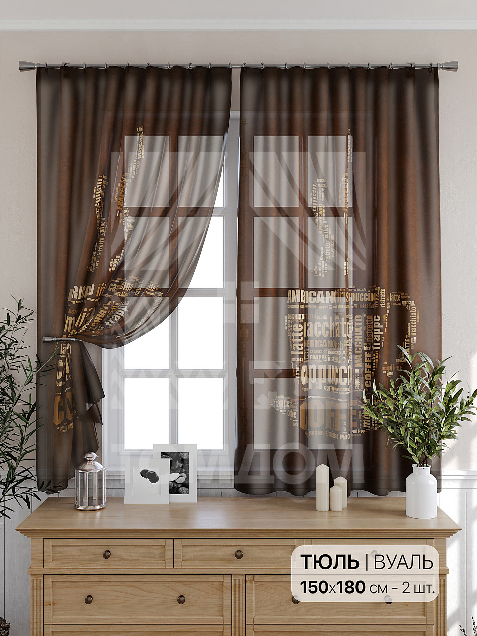 Тюль 2 шт. Подхват - доп.услуга. Легкая основа (вуаль) оформлена принтом. Вуаль с матовой полупрозрачной текстурой. Отличается особым шиком, идеально подходит для создания воздушных штор. Придает ощущение свежести, хорошо пропускает воздух. Ткань неприхотлива в уходе, хорошо стирается без разрушения волокон с течением времени за счет высокого кручения нитей.