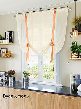 ВыбратьТюль 1 шт. Легкий, мягкий тюль из бежевой вуали дополнен отделкой из атласных лент оранжевого цвета. Тюль имитирует римскую штору. Подъем и опускание осуществляется за счет декоративных лент. Вуаль с матовой полупрозрачной текстурой. Отличается особым шиком, идеально подходит для создания воздушных штор. Придает ощущение свежести, хорошо пропускает воздух. Ткань неприхотлива в уходе, хорошо стирается без разрушения волокон с течением времени за счет высокого кручения нитей.