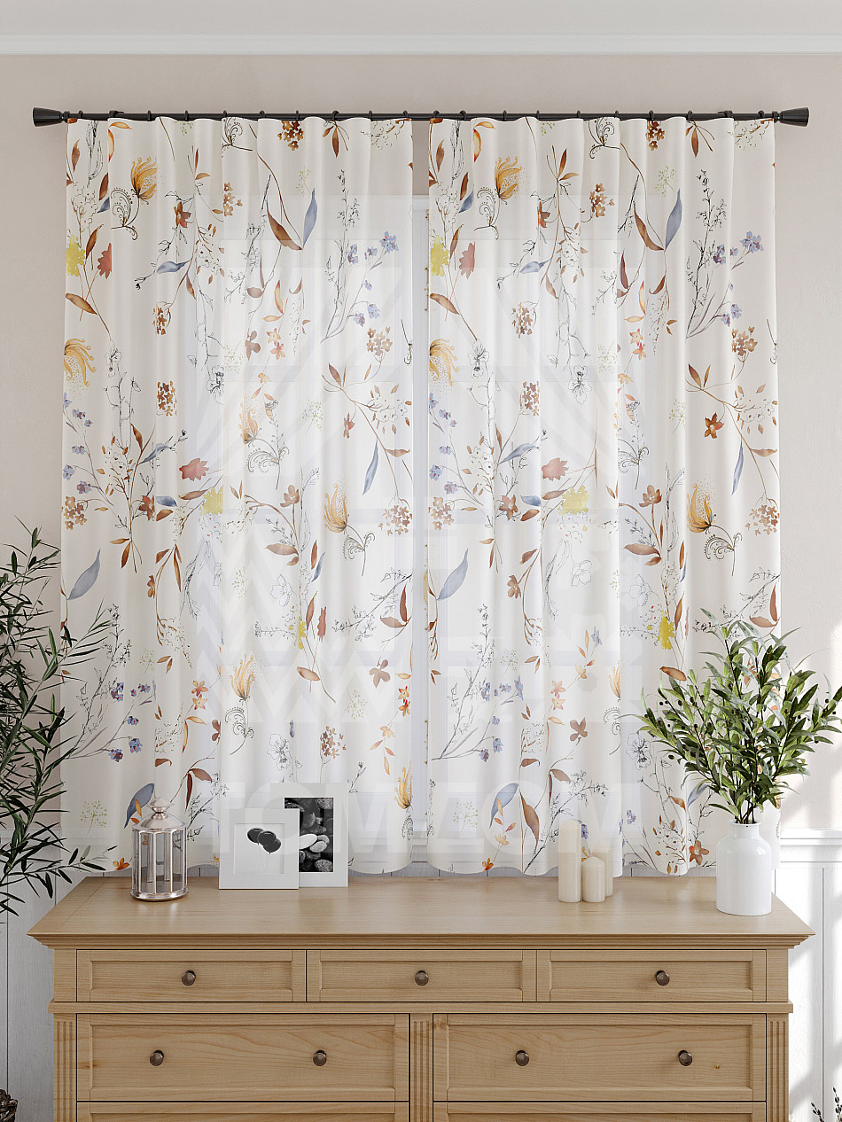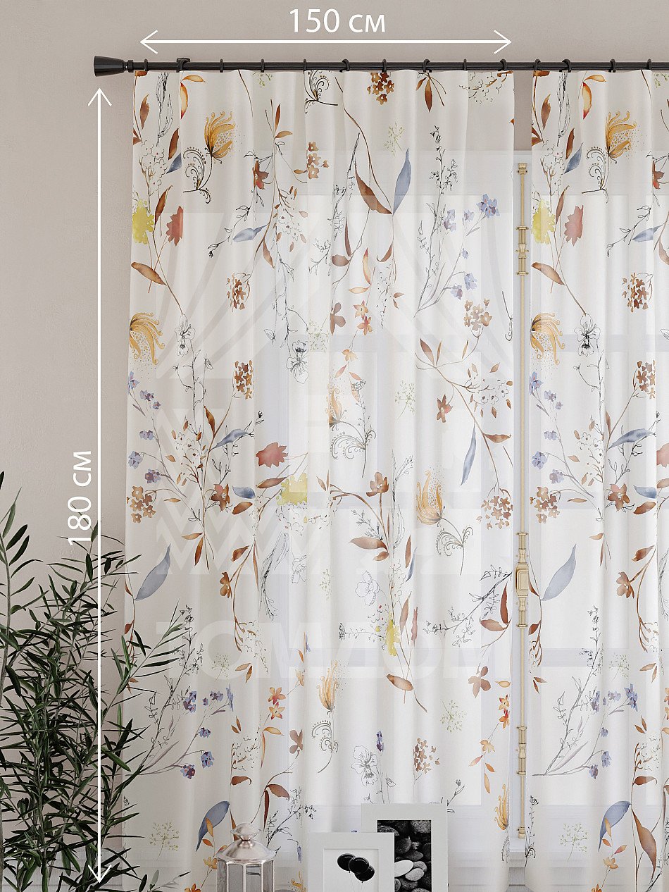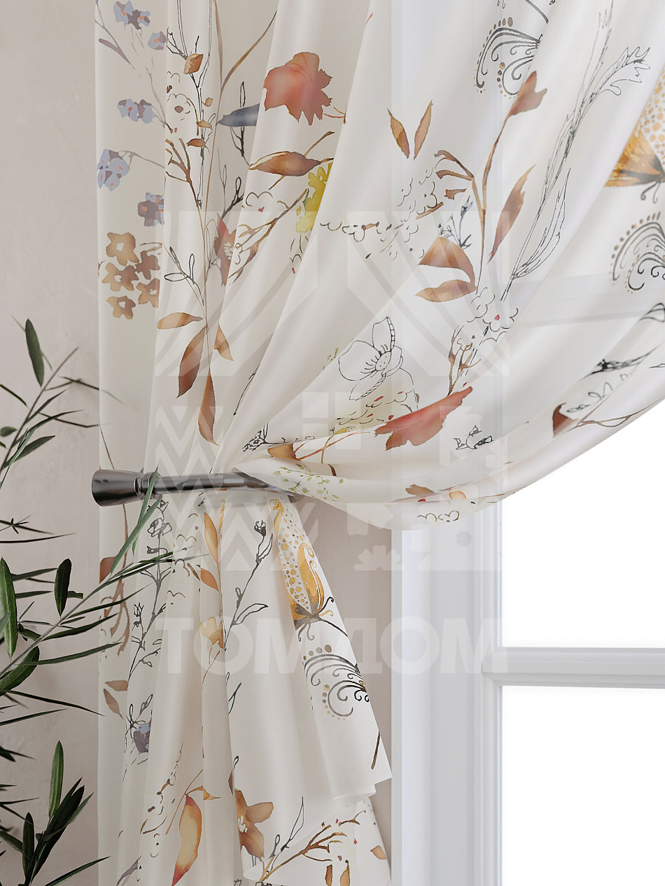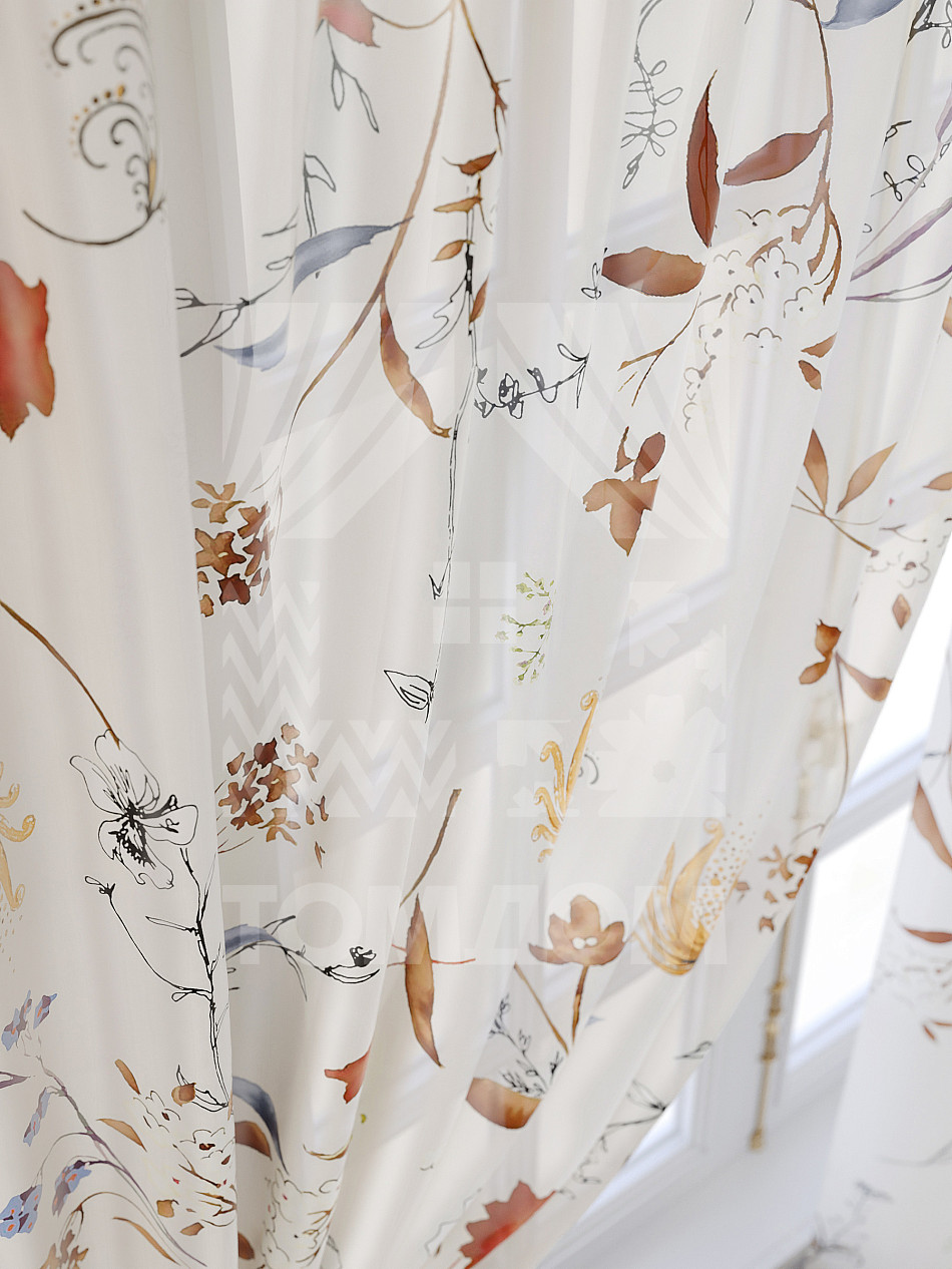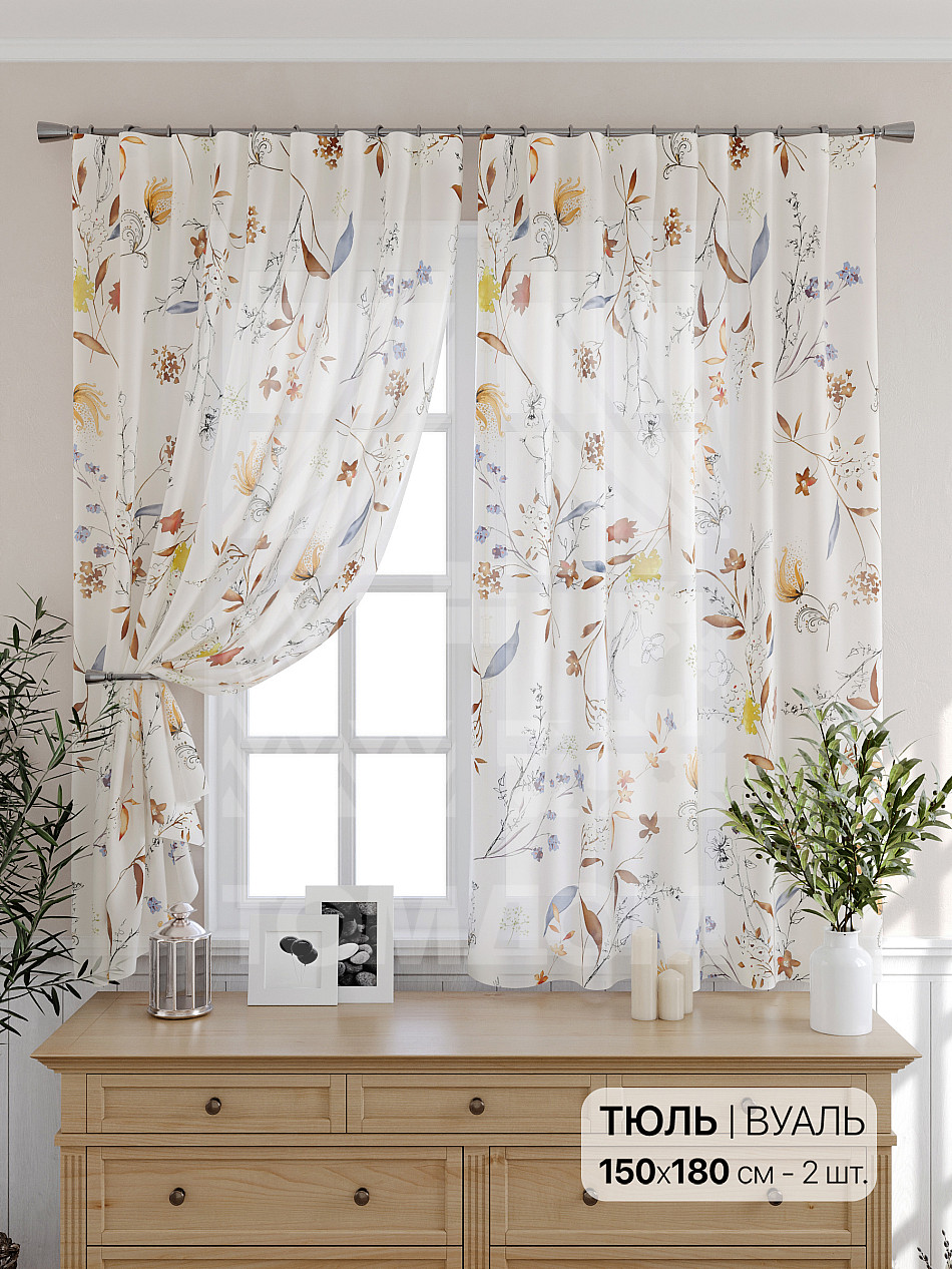 Тюль 2 шт. Подхват - доп.услуга. Легкая основа (вуаль) оформлена принтом. Вуаль с матовой полупрозрачной текстурой. Отличается особым шиком, идеально подходит для создания воздушных штор. Придает ощущение свежести, хорошо пропускает воздух. Ткань неприхотлива в уходе, хорошо стирается без разрушения волокон с течением времени за счет высокого кручения нитей.