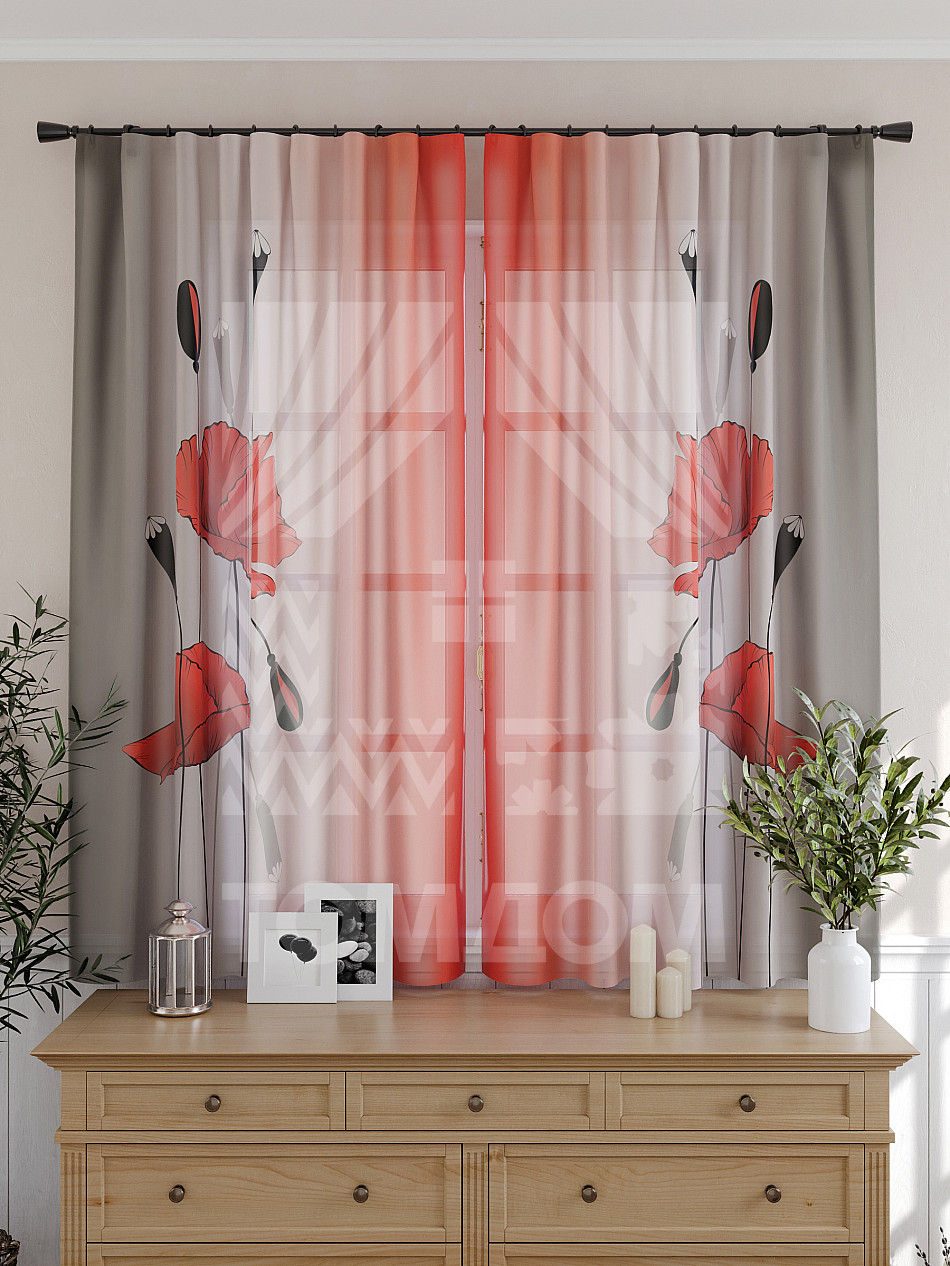 Красные маки с тёмно-серый горизонтальной полосой. Подошли идеально, качество отличное. На окне смотрятся лучше чем на фото. Продавца рекомендую,спасибо.