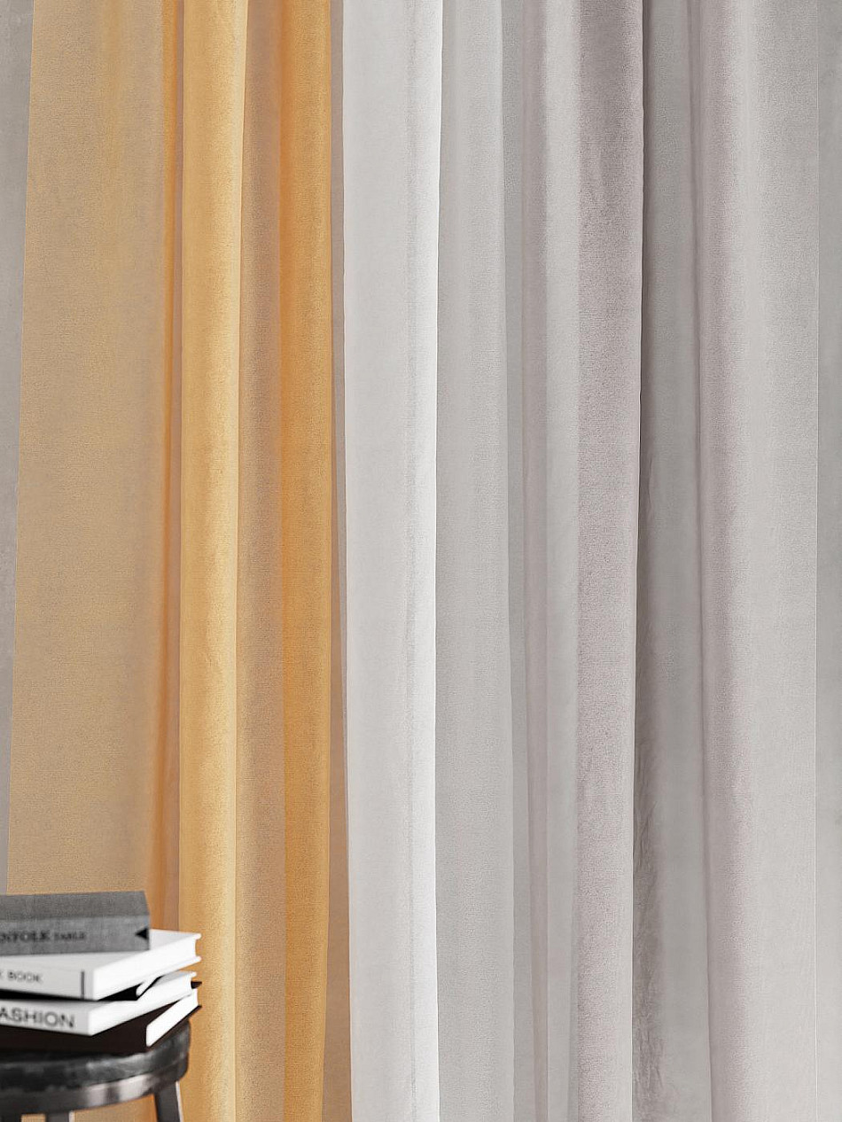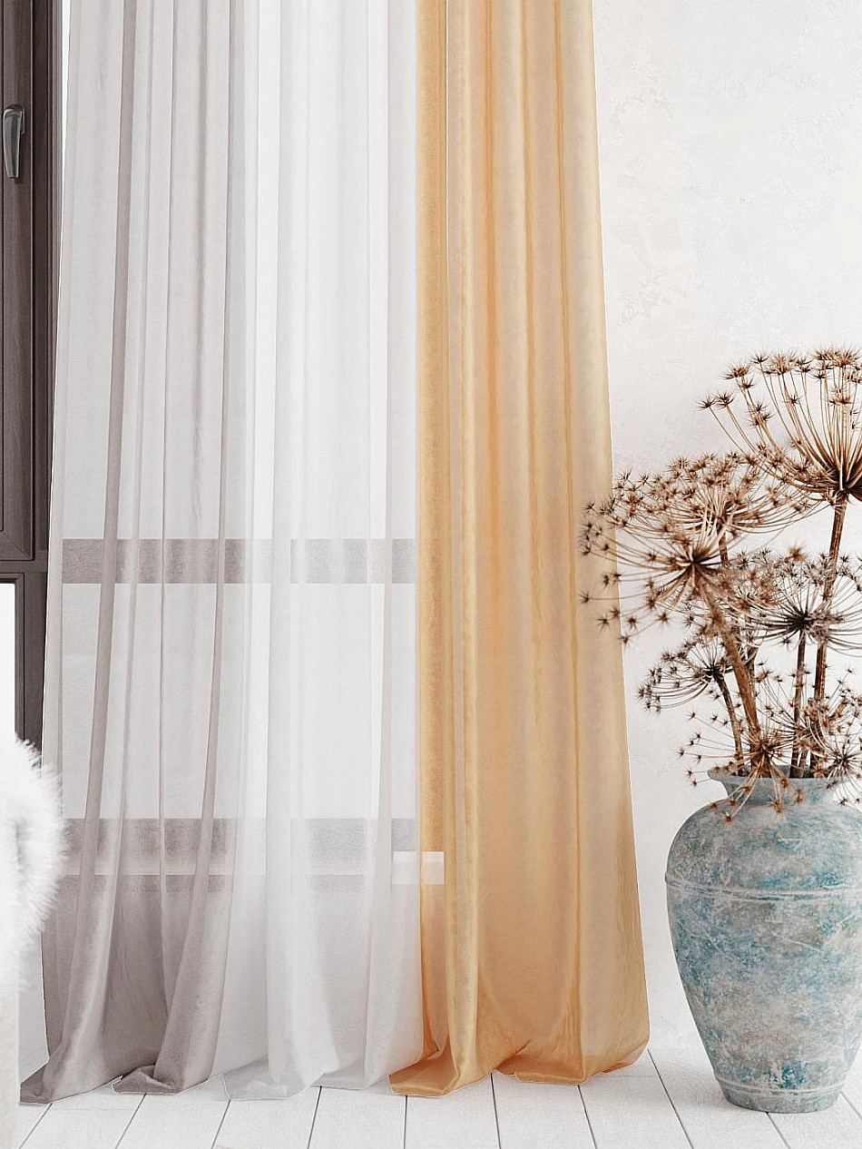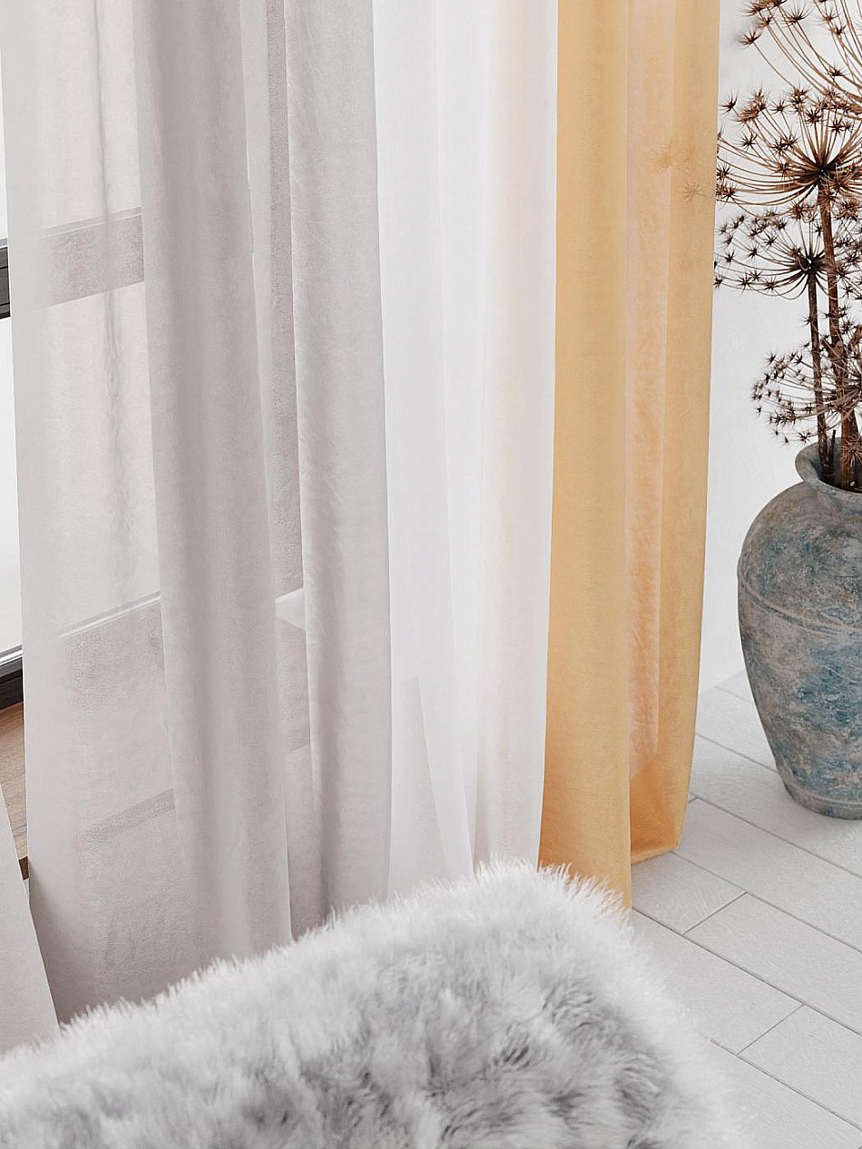 Тюль 2 шт.: Тюлевый комплект из вуали с легкой, элегантной драпировкой. Тюль имеет два стачных шва по вертикали, который после драпировки уходит в складку и становится невидимым. Вуаль с матовой полупрозрачной текстурой. Отличается особым шиком, идеально подходит для создания воздушных штор. Придает ощущение свежести, хорошо пропускает воздух. Ткань неприхотлива в уходе, хорошо стирается без разрушения волокон с течением времени за счет высокого кручения нитей.